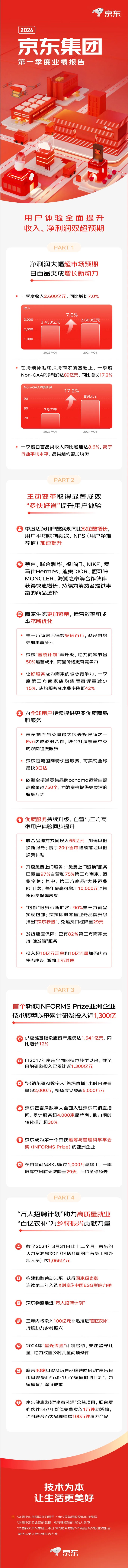 5月16日,京東集團(tuán)發(fā)布2024年一季度業(yè)績。一季度,京東集團(tuán)收入達(dá)2600億元,同比增長7.0%;歸屬于公司普通股股東的凈利潤71億元,同比增長13.9%;非美國通用會計準(zhǔn)則下歸屬于公司普通股股東的凈利潤為89億元,同比增長17.2%。 值得一提的是,京東物流板塊盈利能力提升。16日發(fā)布的京東物流一季報顯示,2024年一季度,京東物流總收入達(dá)421.4億元,同比增長14.7%;凈利潤3.22億元,同比扭虧為盈,去年同期虧損10.37億元;經(jīng)調(diào)整后凈利潤6.63億元,去年同期虧損7.12億元。 01 服務(wù)收入同比增長8.8% 京東集團(tuán)首席執(zhí)行官許冉表示:“我們看到各業(yè)務(wù)已經(jīng)取得切實的成果。尤其是對用戶體驗的重視帶來一季度活躍用戶數(shù)強(qiáng)勁增長。” 京東集團(tuán)財報顯示,一季度,京東集團(tuán)各項用戶指標(biāo)實現(xiàn)大幅提升,季度活躍用戶數(shù)已連續(xù)兩個季度保持同比雙位數(shù)增長,用戶的購物頻次、NPS(凈推薦值)和低線城市用戶數(shù)量都在顯著提升。一季度,京東零售板塊收入2268億元,同比增長6.8%,京東零售的經(jīng)營利潤率4.1%,低于2023年同期的4.6%。 從收入結(jié)構(gòu)來看,受益于積淀多年的供應(yīng)鏈基礎(chǔ)設(shè)施效能持續(xù)釋放,服務(wù)收入增速高于商品收入的增速。一季度,商品收入同比增加6.6%至2085億元。其中,日用百貨品類收入同比增長8.6%至853億元,電子產(chǎn)品及家用電器商品收入同比增長5.3%至1232億元。服務(wù)收入達(dá)到515億元,同比增長8.8%。其中,物流及其他服務(wù)收入同比增長13.8%至322億元,平臺及廣告服務(wù)收入同比增長1.2%至193億元。 02 物流板塊同比扭虧 京東物流的財報顯示,截至2024年3月31日,京東物流的倉儲網(wǎng)絡(luò)已幾乎覆蓋全國所有的縣區(qū),包括由京東自身運營的1600多個倉庫和由云倉生態(tài)平臺上第三方業(yè)主經(jīng)營的2000多個云倉,京東物流的倉儲網(wǎng)絡(luò)總管理面積超過3200萬平方米。在此基礎(chǔ)上,京東物流持續(xù)探索物流大模型、大數(shù)據(jù)、無人科技等新質(zhì)生產(chǎn)力,推動供應(yīng)鏈全流程提質(zhì)增效,以及物流成本下降。受益于業(yè)務(wù)及網(wǎng)絡(luò)結(jié)構(gòu)優(yōu)化、規(guī)模經(jīng)濟(jì)效應(yīng),一季度,京東物流的毛利率達(dá)到7.7%,高于2023年同期4.5%的毛利率。 財報顯示,2024年一季度,京東物流總收入達(dá)421.4億元,同比增長14.7%;凈利潤3.22億元,去年同期虧損10.37億元,同比扭虧為盈;經(jīng)調(diào)整后凈利潤6.63億元,去年同期虧損7.12億元。 從收入結(jié)構(gòu)來看,一季度,京東物流一體化供應(yīng)鏈?zhǔn)杖脒_(dá)205億元,同比增加11.1%;包含快遞、快運等在內(nèi)的來自其他客戶的收入為216.4億元,同比增長18.4%。外部客戶收入達(dá)292.5億元,占比約7成。 京東集團(tuán)財報顯示,截至一季度末,京東的供應(yīng)鏈基礎(chǔ)設(shè)施資產(chǎn)規(guī)模達(dá)到1541億元,同比增長12%。京東集團(tuán)表示,從2017年全面向技術(shù)轉(zhuǎn)型以來,京東體系已經(jīng)投入了近1300億元用于技術(shù)研發(fā)。一季度,京東集團(tuán)庫存周轉(zhuǎn)天數(shù)進(jìn)一步降至29天的歷史最好水平。 03 數(shù)字人直播走向規(guī)模化落地 京東集團(tuán)財報顯示,集團(tuán)新業(yè)務(wù)板塊一季度收入48.7億元,同比下滑19.2%,新業(yè)務(wù)主要包括達(dá)達(dá)、京東產(chǎn)發(fā)、京喜及海外業(yè)務(wù)。 京東集團(tuán)介紹,在業(yè)內(nèi)首創(chuàng)企業(yè)家數(shù)字人直播形式,4月16日,京東集團(tuán)創(chuàng)始人、董事會主席劉強(qiáng)東以AI數(shù)字人的形式加入京東超市、家電家居采銷直播間,1小時內(nèi)觀看量超2000萬。京東將借此進(jìn)一步加碼內(nèi)容生態(tài)建設(shè)。京東云言犀數(shù)字人是京東云全棧自研技術(shù)產(chǎn)品,已經(jīng)從技術(shù)探索走向規(guī)模化落地,已經(jīng)服務(wù)了超4000家品牌商。 對于即將到來的“618”,京東集團(tuán)表示,將在流量生態(tài)、AI技術(shù)和服務(wù)能力三大核心領(lǐng)域投入資源幫助商家有效增長。 財報顯示,2024年5月22日,京東將迎來納斯達(dá)克上市十周年。過去十年,京東收入從上市前2013年的693億元增長16倍至2023年的1.1萬億元,非美國通用會計準(zhǔn)則下歸屬于公司普通股股東的凈利潤由2.24億元增長157倍至2023年的352億元。公司通過股利和股份回購總計回報股東的金額超越過去十年籌集的資本總額。 |