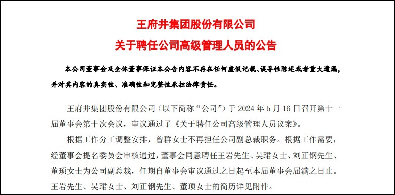 5月16日,王府井集團(tuán)股份有限公司發(fā)布公告,宣布了公司高級(jí)管理人員的變動(dòng)情況。 公告顯示,2024年5月16日舉行的第十一屆董事會(huì)第十次會(huì)議上,王府井集團(tuán)股份有限公司審議并通過了《關(guān)于聘任公司高級(jí)管理人員議案》,根據(jù)工作分工調(diào)整安排,曾群女士不再擔(dān)任公司副總裁職務(wù)。根據(jù)工作需要,經(jīng)董事會(huì)提名委員會(huì)審核通過,董事會(huì)同意聘任王巖先生、吳珺女士、劉正鋼先生、董頊女士為公司副總裁,任期自董事會(huì)審議通過之日起至本屆董事會(huì)屆滿之日止。 王府井董事會(huì)提名委員會(huì)認(rèn)為,本次聘任的高級(jí)管理人員長期從事商業(yè)零售業(yè)務(wù),或在相關(guān)領(lǐng)域工作多年,擁有豐富的行業(yè)工作經(jīng)驗(yàn)、管理經(jīng)驗(yàn)和相關(guān)專業(yè)經(jīng)驗(yàn),教育背景、工作經(jīng)歷及身體狀況均能夠勝任公司高級(jí)管理人員的職責(zé)要求,同意公司聘任王巖先生、吳珺女士、劉正鋼先生、董頊女士擔(dān)任公司副總裁職務(wù),并同意將相關(guān)議案提交公司董事會(huì)審議。 |