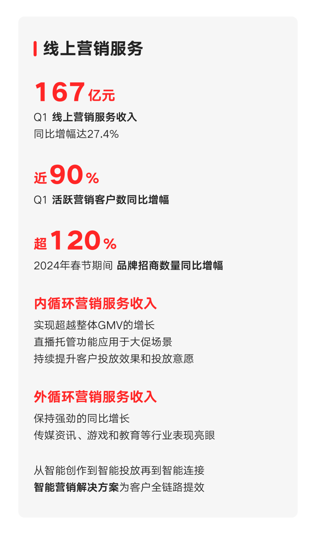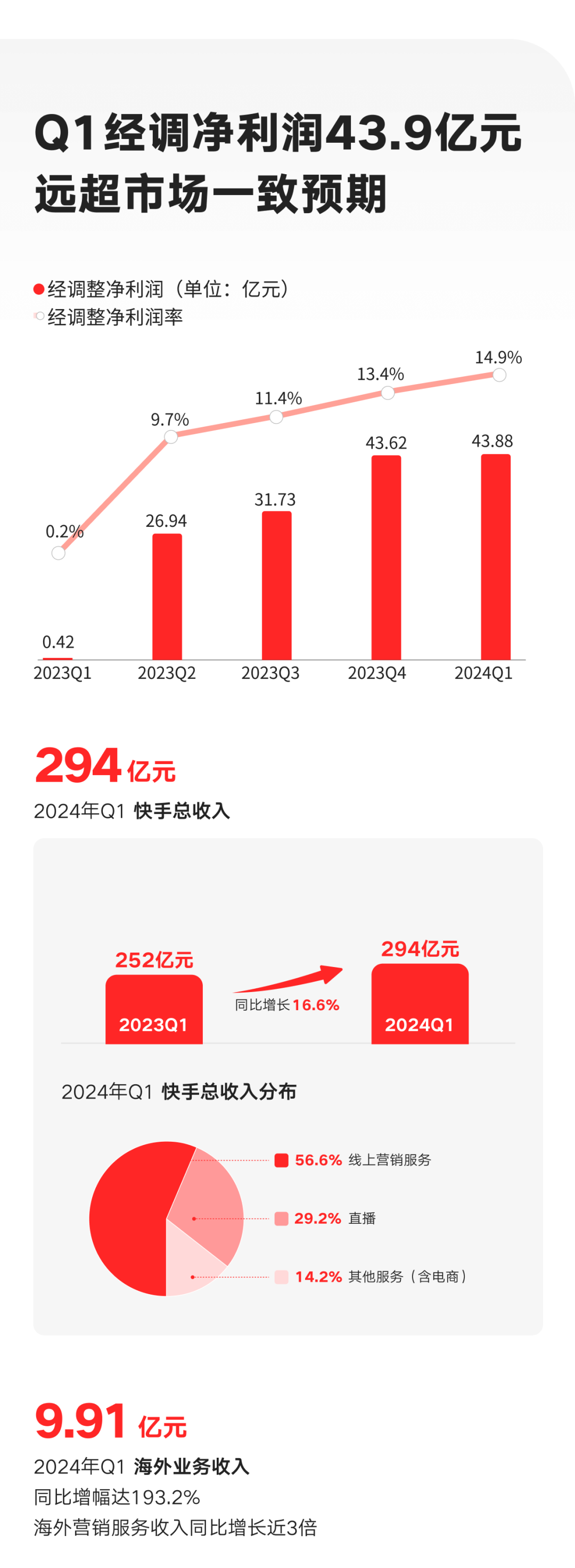 5月22日,快手發(fā)布2024年一季度業(yè)績。 5月22日,快手發(fā)布2024年第一季度財報。財報顯示,公司一季度總營收294億元,同比增長16.6%。 值得注意的是,一季度快手經調整凈利潤同比增長超百倍達43.9億元,創(chuàng)下單季歷史新高,2023年同期經調整凈利潤為4200萬元。 具體來看,線上營銷服務、直播和其他服務對收入的貢獻占比分別為56.6%、29.2%和14.2%。其中,線上營銷服務方面,在行業(yè)淡季快手仍維持27.4%的收入增速。一季度該板塊收入達167億元,持續(xù)獲得市場份額。 電商業(yè)務方面,一季度快手電商GMV(平臺交易總額)達2881億元,同比增長28.2%。受電商業(yè)務增長驅動,其他服務收入從2023年同期的28億元增加至42億元,同比增長47.6%。 海外市場方面,快手第一季度營收同比增長193.2%達9.91億元,其中,營銷收入同比增長接近3倍。 本季度財報發(fā)布后,快手正式宣布啟動新一輪股票回購計劃,稱未來三年將回購總金額不超過160億的港幣股票?焓钟谌ツ5月啟動的40億港幣回購計劃將在今年6月股東大會時到期,截至目前,公司已回購價值30.9億港幣的B類股。 快手在公告中表示,進行股份回購顯示本公司對于自身業(yè)務展望及前景充滿信心,且最終會為本公司帶來裨益及為股東創(chuàng)造價值。董事會認為,公司現有財務資源足以支持股份回購并維持穩(wěn)健的財務狀況。 |