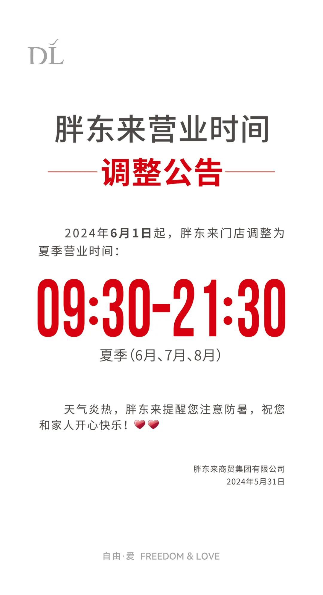 5月31日,胖東來商貿(mào)集團(tuán)在其官方公眾號(hào)上宣布,從2024年6月1日開始,集團(tuán)旗下門店的營業(yè)時(shí)間將進(jìn)行季節(jié)性調(diào)整,以適應(yīng)夏季(即6月、7月、8月)的作息習(xí)慣。屆時(shí),各門店的營業(yè)時(shí)間將調(diào)整為每日早上09:30開門,直至晚上21:30結(jié)束營業(yè)。 |