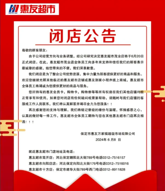 《職業(yè)零售網(wǎng)》獲悉,6月10日,惠友超市茂業(yè)店發(fā)布停業(yè)公告,稱將于6月20日閉店。 公告顯示,由于公司經(jīng)營(yíng)方向與業(yè)務(wù)調(diào)整,經(jīng)公司研究決定惠友超市茂業(yè)店將于6月20日正式閉店。在此,惠友超市茂業(yè)店全體員工向多年來(lái)支持和信任我們的顧客表示最誠(chéng)摯的感謝,給您帶來(lái)的不便,我們深表款意。 我們閉店是為了整合公司優(yōu)勢(shì)資源,集中力量為顧客提供更好的商品和服務(wù)。歡迎您繼續(xù)光顧其他臨近的惠友超市店鋪或惠友到家小程序線上商城,惠友超市全體員工將竭誠(chéng)為您提供更好的商品與服務(wù)。 對(duì)于惠友會(huì)員卡,購(gòu)物卡,購(gòu)物券等等所有權(quán)益在我們其他店鋪均能正常享有和使用。 |