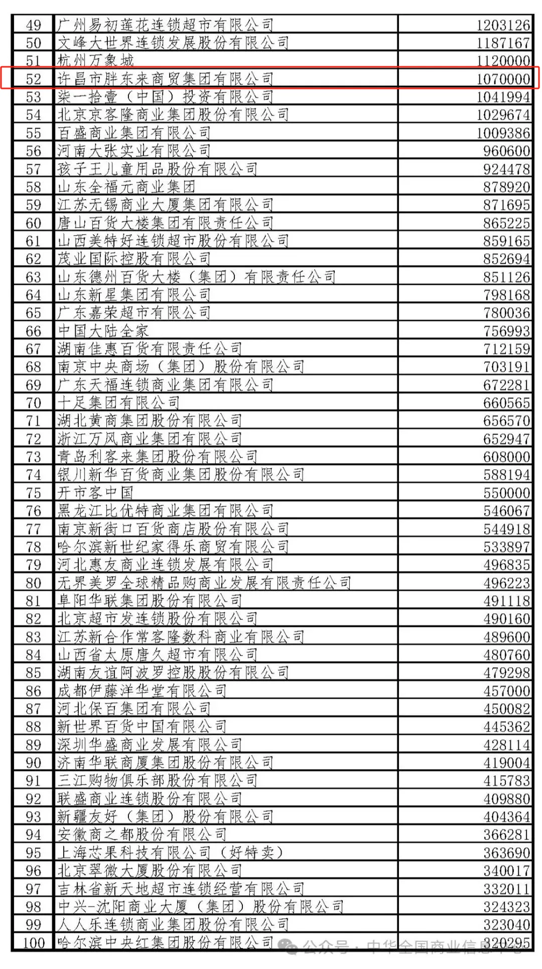 6月16日,中國商業(yè)聯(lián)合會(huì)、中華全國商業(yè)信息中心聯(lián)合發(fā)布2023年度中國零售百強(qiáng)企業(yè)名單。 統(tǒng)計(jì)數(shù)據(jù)顯示,2023年中國零售百強(qiáng)企業(yè)的銷售規(guī)模為3.4萬億元,按可比口徑計(jì)算,同比增長3.3%,增速較2022年提升7.5個(gè)百分點(diǎn)。零售百強(qiáng)企業(yè)與中國商品零售市場恢復(fù)態(tài)勢整體保持一致。 記者梳理發(fā)現(xiàn),河南3家企業(yè)上榜,分別為鄭州丹尼斯百貨有限公司、許昌市胖東來商貿(mào)集團(tuán)有限公司、河南大張實(shí)業(yè)有限公司。 其中,鄭州丹尼斯百貨以268億元的銷售規(guī)模排第29位,許昌市胖東來商貿(mào)集團(tuán)有限公司以107億元的銷售規(guī)模排第52位,河南大張實(shí)業(yè)有限公司以96.06億元的銷售規(guī)模排第56位。 |