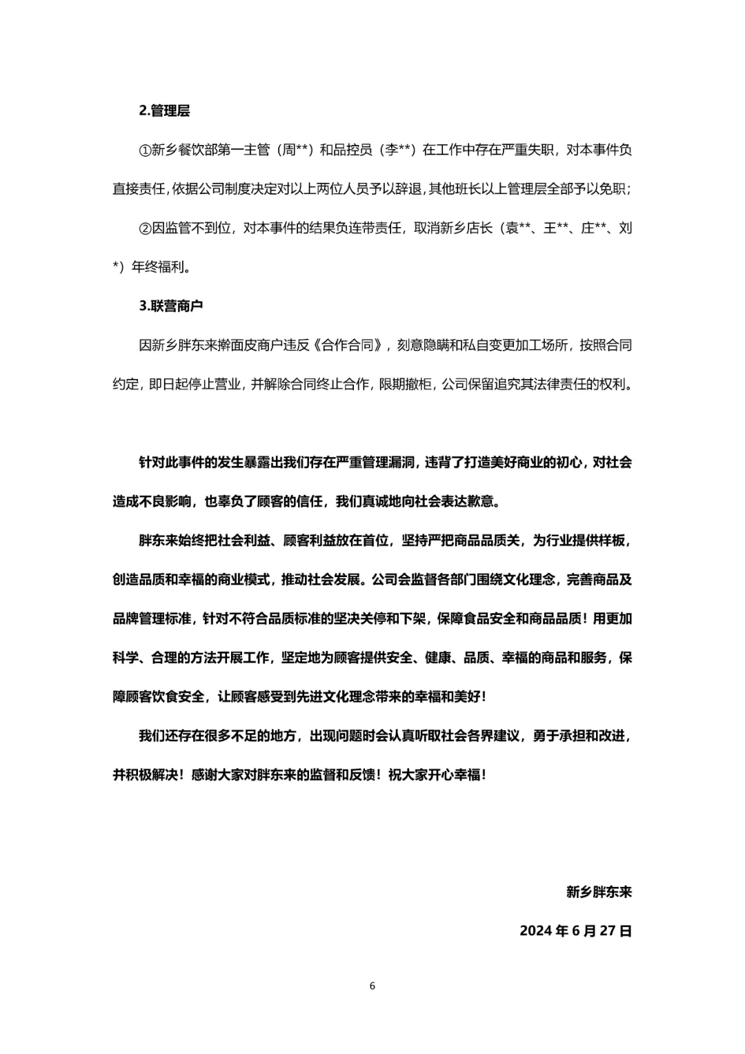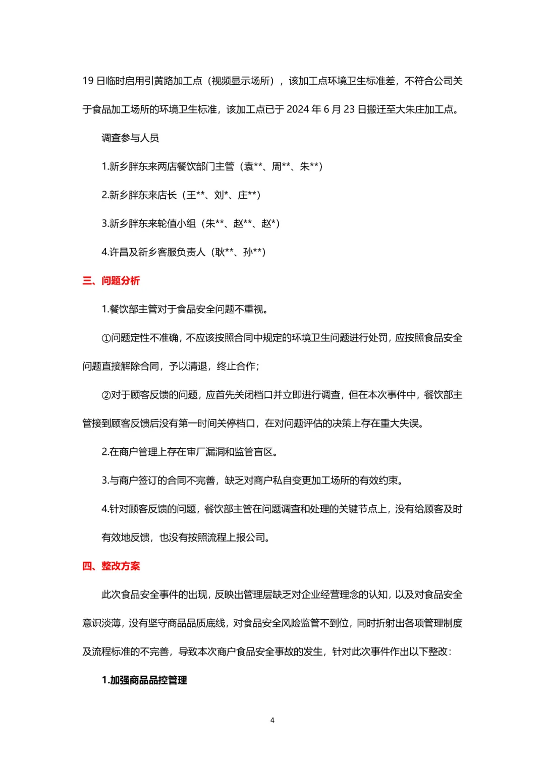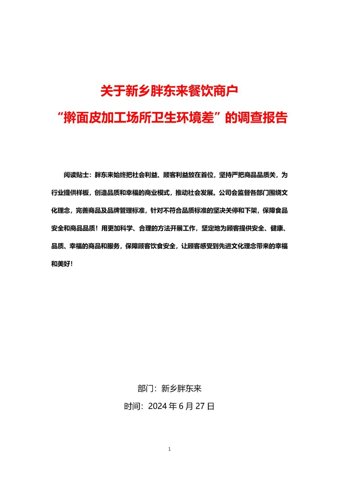 6月27日凌晨,“胖東來商貿(mào)集團(tuán)”官方公號發(fā)布《關(guān)于新鄉(xiāng)胖東來餐飲商戶“搟面皮加工場所衛(wèi)生環(huán)境差”的調(diào)查報告》,對于幫助其發(fā)現(xiàn)了重大食品安全隱患的顧客,給予該顧客10萬元現(xiàn)金獎勵;對所有于2024年6月9日至2024年6月19日期間在新鄉(xiāng)胖東來兩店餐飲部購買搟面皮、香辣面的顧客辦理退款,給予1000元補(bǔ)償(共計8833份);并對胖東來相關(guān)工作人員予以辭退、免職、取消年終福利;要求新鄉(xiāng)胖東來搟面皮商戶即日起停止?fàn)I業(yè),并解除合同終止合作,限期撤柜。 此前,有顧客于6月25日晚上在抖音平臺反饋,新鄉(xiāng)胖東來聯(lián)營餐飲“搟面皮”加工場所衛(wèi)生環(huán)境較差的問題,接到顧客反饋后胖東來高度重視,立即要求新鄉(xiāng)兩店餐飲部所有的聯(lián)營商戶檔口進(jìn)行關(guān)停,并成立調(diào)查小組結(jié)合餐飲部門主管對此事進(jìn)行嚴(yán)格調(diào)查落實。 根據(jù)調(diào)查報告,6月19日上午11:00,有顧客到新鄉(xiāng)市胖東來生活廣場餐飲部反饋商戶搟面皮在引黃路中段有加工點,其環(huán)境衛(wèi)生狀況差,并提供了現(xiàn)場的視頻錄像。在接到顧客反饋后,結(jié)合之前餐飲部的訪廠記錄進(jìn)行查閱,發(fā)現(xiàn)該加工點與登記報備加工點(八里營)不一致。當(dāng)日下午 13:00餐飲部安排人員根據(jù)顧客提供的地址確認(rèn)該加工點路線及位置。 6月20日早6:00,餐飲部安排品控人員進(jìn)行調(diào)查,9:30確認(rèn)送貨面包車從該加工點出發(fā),將面筋、豆芽、辣椒油送貨至新鄉(xiāng)胖東來兩店餐飲搟面皮檔口。經(jīng)調(diào)查確認(rèn)顧客反饋信息屬實后,餐飲部要求搟面皮檔口在6月20日當(dāng)天停止?fàn)I業(yè)進(jìn)行整改,并將引黃路加工點關(guān)停,同時按照合同商品管理標(biāo)準(zhǔn)規(guī)定處以 5000元罰款。 經(jīng)過三天的停業(yè)整改,搟面皮負(fù)責(zé)人于6月22日下午稱其各項問題已整改完畢,餐飲部安排品控人員和部門直屬主管一同前往引黃路加工點,確認(rèn)該加工點已處于關(guān)閉狀態(tài),并對新登記報備的加工點(大朱莊)進(jìn)行調(diào)查,確認(rèn)其加工環(huán)境符合公司標(biāo)準(zhǔn)。根據(jù)以上調(diào)查情況,餐飲部決定該搟面皮檔口于6月23日恢復(fù)營業(yè)。 6月26日上午公司看到抖音作品后,成立調(diào)查小組介入處理。 經(jīng)餐飲部與商戶溝通,了解到因其加工點搬遷,于2024年6月9日至2024年6月19 日臨時啟用引黃路加工點(視頻顯示場所),該加工點環(huán)境衛(wèi)生標(biāo)準(zhǔn)差,不符合公司關(guān)于食品加工場所的環(huán)境衛(wèi)生標(biāo)準(zhǔn),該加工點已于2024年6月23日搬遷至大朱莊加工點。 對于本次事件,胖東來商貿(mào)集團(tuán)公布處理結(jié)果: 1、顧客 ①對于幫助我們發(fā)現(xiàn)了重大食品安全隱患的顧客,為感謝其對我們的監(jiān)督和幫助,給予該顧客10萬元現(xiàn)金獎勵; ②對所有于2024年6月9日至2024年6月19日期間在新鄉(xiāng)胖東來兩店餐飲部購買搟面皮、香辣面的顧客辦理退款,給予1000元補(bǔ)償。(共計8833份,顧客可持有效支付憑證到購買門店餐飲部辦理) 2、管理層 ①新鄉(xiāng)餐飲部第一主管(周**)和品控員(李**)在工作中存在嚴(yán)重失職,對本事件負(fù)直接責(zé)任,依據(jù)公司制度決定對以上兩位人員予以辭退,其他班長以上管理層全部予以免職; ②因監(jiān)管不到位,對本事件的結(jié)果負(fù)連帶責(zé)任,取消新鄉(xiāng)店長(袁**、王**、莊**、劉*)年終福利。 3、聯(lián)營商戶 因新鄉(xiāng)胖東來搟面皮商戶違反《合作合同》,刻意隱瞞和私自變更加工場所,按照合同約定,即日起停止?fàn)I業(yè),并解除合同終止合作,限期撤柜,公司保留追究其法律責(zé)任的權(quán)利。 胖東來商貿(mào)集團(tuán)稱,本次問題主要有: 1、餐飲部主管對于食品安全問題不重視。 ①問題定性不準(zhǔn)確,不應(yīng)該按照合同中規(guī)定的環(huán)境衛(wèi)生問題進(jìn)行處罰,應(yīng)按照食品安全問題直接解除合同,予以清退,終止合作; ②對于顧客反饋的問題,應(yīng)首先關(guān)閉檔口并立即進(jìn)行調(diào)查,但在本次事件中,餐飲部主管接到顧客反饋后沒有第一時間關(guān)停檔口,在對問題評估的決策上存在重大失誤。 2、在商戶管理上存在審廠漏洞和監(jiān)管盲區(qū)。 3、與商戶簽訂的合同不完善,缺乏對商戶私自變更加工場所的有效約束。 4、針對顧客反饋的問題,餐飲部主管在問題調(diào)查和處理的關(guān)鍵節(jié)點上,沒有給顧客及時有效地反饋,也沒有按照流程上報公司。 對此,胖東來商貿(mào)集團(tuán)提出整改方案: 1、加強(qiáng)商品品控管理 ①對餐飲部所有商戶的加工操作從供貨源頭、原材料品質(zhì)、加工環(huán)境、操作、物流配送等項目進(jìn)行徹底排查,同步對全業(yè)態(tài)其他商戶進(jìn)行排查,對不符合公司標(biāo)準(zhǔn)的商戶堅決予以清退; ②依據(jù)商品品質(zhì)標(biāo)準(zhǔn),制定全員培訓(xùn)計劃,從管理層到員工到商戶,全方位提高食品安全的重視度,從審廠、訂貨、驗收、儲存、周轉(zhuǎn)標(biāo)準(zhǔn)嚴(yán)格落實商品質(zhì)量的管控措施,杜絕不合格商品上架銷售。 2、完善各項管理制度及工作標(bi