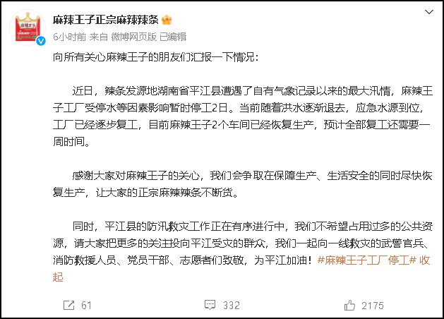 7月3日,麻辣王子官方微博號(hào)對(duì)“工廠停工”一事公開(kāi)表示,近日,麻辣王子工廠受停水等因素影響暫時(shí)停工2日。當(dāng)前工廠已經(jīng)逐步復(fù)工,目前麻辣王子2個(gè)車間已經(jīng)恢復(fù)生產(chǎn)。 記者咨詢麻辣王子方面,公司倉(cāng)庫(kù)是否受到影響、庫(kù)存是否足夠、生產(chǎn)受影響會(huì)否導(dǎo)致缺貨情況出現(xiàn)等問(wèn)題,麻辣王子7月3日回應(yīng)稱,工廠受停水等因素影響暫時(shí)停工2日了。不過(guò)現(xiàn)在工廠已經(jīng)逐步復(fù)工,目前2個(gè)車間已經(jīng)恢復(fù)生產(chǎn),預(yù)計(jì)還有一周時(shí)間就可以全部恢復(fù)生產(chǎn)。 “公司長(zhǎng)沙倉(cāng)庫(kù)里是有庫(kù)存的,只要能拍到的產(chǎn)品都可以按時(shí)發(fā)貨。我們會(huì)爭(zhēng)取在保障生產(chǎn)、生活安全的同時(shí)盡快恢復(fù)生產(chǎn)!甭槔蓖踝臃矫姹硎。 據(jù)了解,麻辣王子此次工廠停工主要是前期生產(chǎn)線因?yàn)橥K芰擞绊,“工廠地勢(shì)比較高,沒(méi)有內(nèi)澇”。 據(jù)平江縣大愛(ài)平江慈善基金會(huì)公號(hào)7月2日消息,“大愛(ài)平江”秘書(shū)處在理事會(huì)的指導(dǎo)下于7月2日下午12時(shí)41分發(fā)出抗洪救災(zāi)倡議書(shū),當(dāng)天下午,基金會(huì)公布愛(ài)心捐贈(zèng)榜,其中,湖南麻辣王子食品有限公司捐款金額為100萬(wàn)元。 |