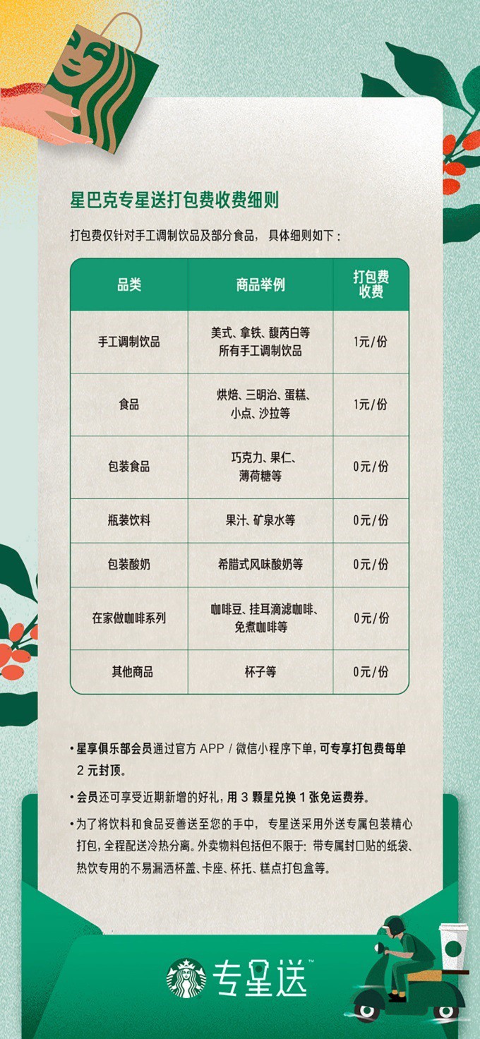 7月3日,星巴克官宣,從今日起,專星送的服務(wù)收費方式將進行整合調(diào)整。 其中,配送費從每單9元下調(diào)至7元,部分商品開始收取每件1元的打包費。此外,星享俱樂部會員通過官方APP/微信小程序下單,可專享打包費每單2元封頂。 同時,會員還可享近期新增的好禮,用3顆星兌換1張免運費券。 另外,專星送也將采用外送專屬包裝,包括熱飲專用的不易漏灑杯蓋、外送專用的帶封口貼的紙袋,并采用冷熱分離的方式,分開進行打包配送。 據(jù)透露,根據(jù)最新數(shù)據(jù)統(tǒng)計,專星送所有訂單的平均送達時間為17分鐘,實現(xiàn)絕大多數(shù)訂單可在20分鐘內(nèi)送達。 |