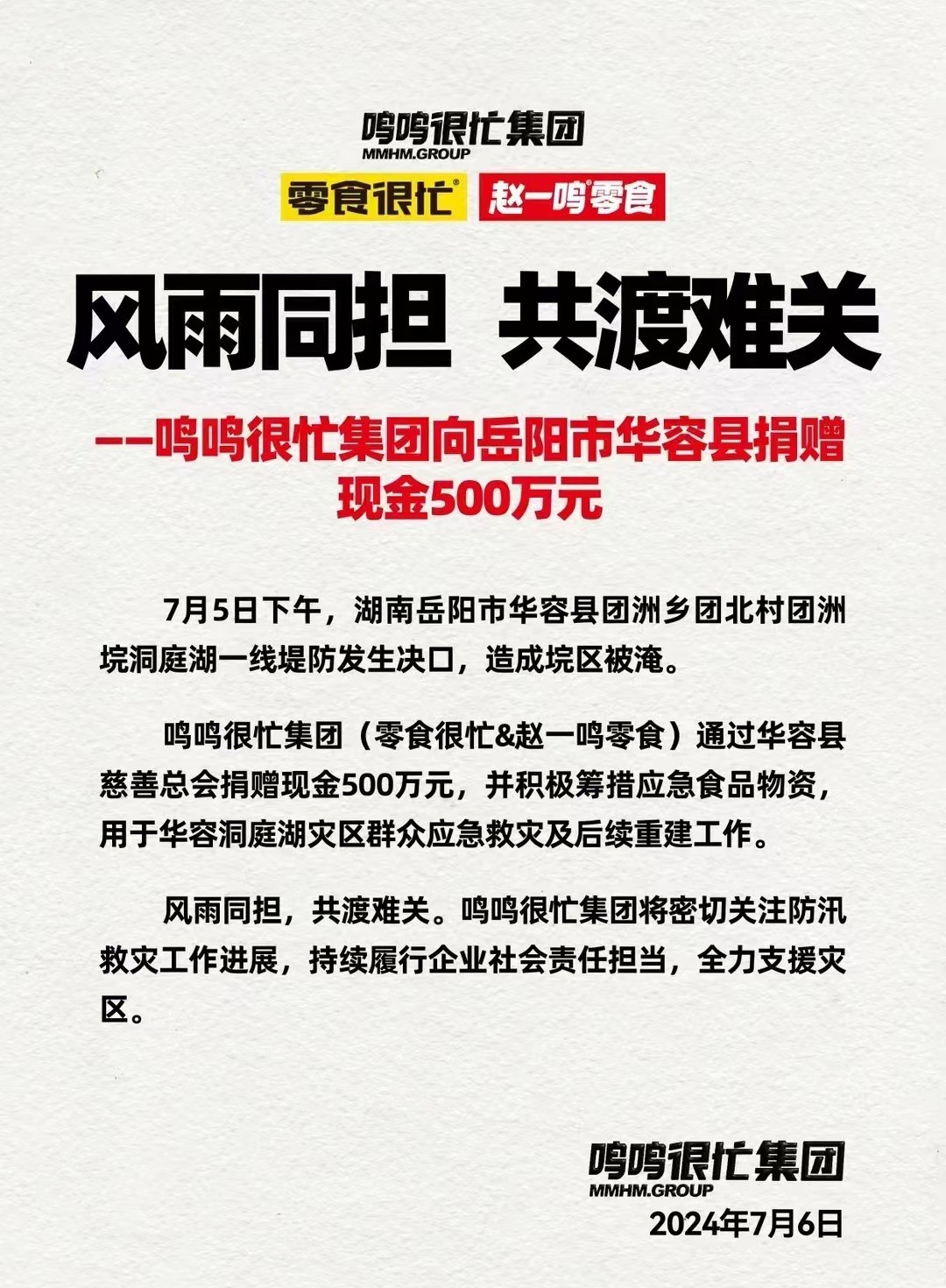 7月5日下午,湖南省岳陽市華容縣團洲鄉(xiāng)團北村團洲垸洞庭湖一線堤防發(fā)生決堤險情,牽動著大家的心。7月6日,鳴鳴很忙集團通過華容縣慈善總會捐贈現(xiàn)金500萬元,并積極籌措應急食品物資,用于華容洞庭湖災區(qū)群眾應急救災及后續(xù)重建工作。 鳴鳴很忙集團表示,將密切關注防汛救災工作進展,持續(xù)履行企業(yè)社會責任擔當,全力支援災區(qū)。今年6月,零食很忙集團變更為鳴鳴很忙集團,并且旗下品牌零食很忙、趙一鳴零食全國門店總數(shù)突破了1萬家,成為中國零食連鎖行業(yè)首個萬店企業(yè)。 |