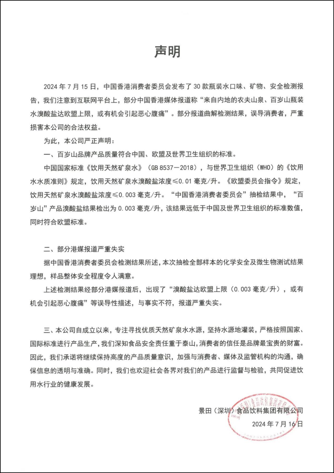 繼農夫山泉向香港消費者委員會發(fā)律師函后,百歲山也發(fā)表了聲明。 7月16日晚間,針對香港消費者委員會發(fā)布的百歲山瓶裝水樣本檢出每升3微克的溴酸鹽,達到歐盟適用于經臭氧處理的天然礦泉水和泉水的溴酸鹽最大限值一事,百歲山發(fā)表聲明稱,公司品牌產品質量符合中國、歐盟及世界衛(wèi)生組織的標準,部分報道曲解檢測結果,誤導消費者,嚴重損害公司的合法權益。 7月15日,香港消費者委員會披露,在本地市面上購買了30款常見的瓶裝水樣本進行測試后發(fā)現(xiàn),來自內地的百歲山和農夫山泉的瓶裝水樣本均檢出每升3微克的溴酸鹽,達到歐盟適用于經臭氧處理的天然礦泉水和泉水的溴酸鹽最大限值,但遠低于美國、日本、英國以及世界衛(wèi)生組織訂立的飲用水質量標準——每升10微克溴酸鹽。 自然界的水中幾乎沒有溴酸鹽,飲用水在進行臭氧消毒殺菌的過程中,水體中自然存在的溴化物就會在臭氧的作用下變成溴酸鈉、溴酸鉀等溴酸鹽類物質。香港消費者委員會表示,攝取大量溴酸鹽可導致惡心、腹痛、嘔吐及腹瀉,嚴重情況還有可能影響腎臟及神經系統(tǒng)。 對此,百歲山聲明稱,部分報道曲解檢測結果,誤導消費者,嚴重損害公司的合法權益。 百歲山表示,公司品牌產品質量符合中國、歐盟及世界衛(wèi)生組織的標準。中國國家標準《飲用天然礦泉水》與世界衛(wèi)生組織(WHO)的《飲用水水質準則》規(guī)定,飲用天然礦泉水溴酸鹽濃度0.01毫克/升。《歐盟委員會指令》規(guī)定飲用天然礦泉水溴酸鹽濃度≤0.003毫克/升。香港消費者委員會抽檢結果中,“百歲山”產品溴酸鹽結果檢出為0.003毫克/升,該結果遠低于中國及世界衛(wèi)生組織的標準數(shù)值同時符合歐盟標準。 百歲山表示,檢測結果經部分港媒報道后,出現(xiàn)了“溴酸鹽達歐盟上限(0.003毫克/升),或有機會引起惡心腹痛”等誤導性描述,與事實不符,報道嚴重失實。 百歲山進一步表示,公司自成立以來,專注尋找優(yōu)質天然礦泉水水源,堅持水源地灌裝,嚴格按照國家國際標準進行產品生產,公司深知食品安全責任重于泰山,消費者的信任是品牌最寶貴的財富。 |