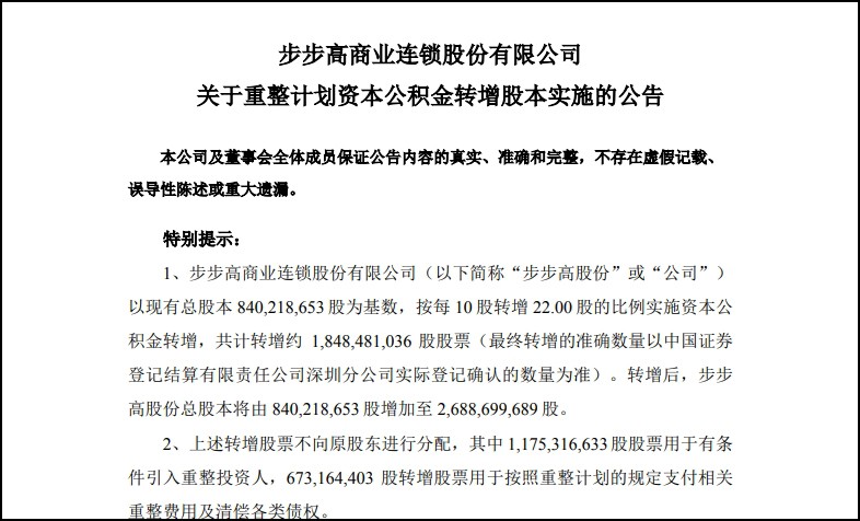 7月29日晚間,步步高商業(yè)連鎖股份有限公司(簡稱“步步高”,股票代碼:002251.SZ)發(fā)布公告稱,根據(jù)湘潭市中級人民法院裁定批準的《步步高商業(yè)連鎖股份有限公司及其十四家子公司重整計劃》,公司正式啟動了資本公積金轉(zhuǎn)增方案。 該方案以現(xiàn)有總股本840,218,653股為基數(shù),按每10股轉(zhuǎn)增22股的比例執(zhí)行,預(yù)計轉(zhuǎn)增股票總數(shù)約為1,848,481,036股(最終數(shù)量以中國證券登記結(jié)算有限責任公司深圳分公司實際登記為準)。此次轉(zhuǎn)增的股權(quán)登記日定于2024年8月1日,而新增股份將于次日,即2024年8月2日正式上市。同時,為配合此次轉(zhuǎn)增,公司計劃于8月1日向深圳證券交易所申請股票停牌一天,并于8月2日復(fù)牌交易。 此次資本公積金轉(zhuǎn)增的實施,標志著步步高在財務(wù)重整與戰(zhàn)略調(diào)整之路上邁出了至關(guān)重要的一步,此舉不僅是公司重整計劃的核心內(nèi)容,更是其優(yōu)化資本結(jié)構(gòu)、強化財務(wù)穩(wěn)健性的關(guān)鍵策略。步步高不僅為后續(xù)戰(zhàn)略投資者的引入、債務(wù)清償及重整費用的支付奠定了堅實的資本基礎(chǔ),還成功推動了短期債務(wù)向長期債務(wù)的轉(zhuǎn)化,優(yōu)化了債務(wù)結(jié)構(gòu),顯著降低了負債水平,預(yù)計凈資產(chǎn)將得到大幅提升。這一系列的積極變化,不僅增強了公司的資金流動性和償債能力,更為其未來的長期穩(wěn)健發(fā)展鋪設(shè)了堅實的道路,奠定了穩(wěn)固的基石。 尤為引人注目的是,本次轉(zhuǎn)增中約1,175,316,633股(占總轉(zhuǎn)增股份近三分之二)將定向用于引入具有產(chǎn)業(yè)背景和戰(zhàn)略協(xié)同能力的產(chǎn)業(yè)投資人及財務(wù)投資人。產(chǎn)業(yè)投資人包括白兔集團、外貿(mào)信托(聯(lián)合中化農(nóng)業(yè))、湘潭電化產(chǎn)投以及物美集團與博雅春芽聯(lián)合體,他們將攜資金、管理理念、業(yè)務(wù)資源及市場網(wǎng)絡(luò),助力步步高加速轉(zhuǎn)型升級,拓寬業(yè)務(wù)領(lǐng)域,提升市場競爭力。 其中,白兔集團將與步步高建立合資公司,進行“產(chǎn)品嚴選”,打造自營商品品牌,致力于建立全球供應(yīng)鏈優(yōu)勢;外貿(mào)信托(聯(lián)合中化農(nóng)業(yè))將優(yōu)化生鮮供應(yīng)鏈;湘潭電化產(chǎn)投將依托本地國企實力引入優(yōu)質(zhì)糧食資源;物美集團與博雅春芽則將在供應(yīng)鏈整合、品牌賦能及數(shù)字化零售方面發(fā)揮優(yōu)勢。這些投資人的加入,與步步高的渠道優(yōu)勢形成互補,共同構(gòu)建了零售經(jīng)營的全鏈條生態(tài),有力推動了公司的戰(zhàn)略轉(zhuǎn)型與財務(wù)重整進程。格外值得關(guān)注的是,產(chǎn)業(yè)投資人在本次資本公積金轉(zhuǎn)增中取得的股票,除外貿(mào)信托(聯(lián)合中化農(nóng)業(yè))的鎖定期為24個月外,其余三家投資人白兔集團、湘潭電化產(chǎn)投、物美集團與博雅春芽的鎖定期均為36個月,進一步彰顯了產(chǎn)業(yè)投資人與步步高深度融合、長期助力步步高變革發(fā)展的堅定態(tài)度與信心! 此外,剩余的673,164,403股轉(zhuǎn)增股票則將嚴格按照重整計劃的規(guī)定,以9.69元/股的定價,用于清償各類債權(quán)。這一安排充分體現(xiàn)了步步高對債權(quán)人利益的尊重與保護。通過科學(xué)合理的債務(wù)清償方案,步步高股份有效減輕了債務(wù)負擔,且有財產(chǎn)擔保債權(quán)年化利息降至2.15%,大幅降低了財務(wù)費用,為公司后續(xù)的穩(wěn)健發(fā)展營造了更加寬松和有利的環(huán)境。此舉也贏得了債權(quán)人的廣泛理解和支持,為重整計劃的順利推進提供了堅實的保障。 在經(jīng)營戰(zhàn)略調(diào)整方面,步步高明確了超市與百貨業(yè)務(wù)的優(yōu)化方向。超市業(yè)務(wù)將借鑒“胖東來”等優(yōu)秀企業(yè)的經(jīng)驗,通過提升服務(wù)質(zhì)量、拓展供應(yīng)渠道、加強線上線下營銷及改革采購評價機制等措施,全面提升經(jīng)營水平。百貨業(yè)務(wù)則加速數(shù)字化建設(shè),通過銷售模式創(chuàng)新、物流配送優(yōu)化、人員管理升級及服務(wù)質(zhì)量提升等策略,實現(xiàn)全面優(yōu)化升級。 綜上所述,步步高此次實施的資本公積金轉(zhuǎn)增計劃是其重整戰(zhàn)略的重要組成部分和關(guān)鍵舉措。隨著重整計劃的深入實施和各項經(jīng)營戰(zhàn)略調(diào)整的逐步落地,步步高有望迎來更加廣闊的發(fā)展空間和更加光明的未來。 |