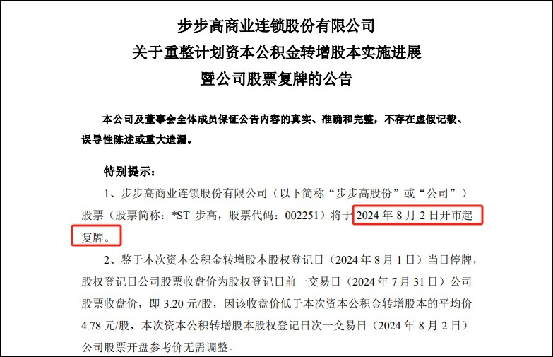 8月1日,步步高商業(yè)連鎖股份有限公司(*ST步高)發(fā)布關(guān)于重整計劃資本公積金轉(zhuǎn)增股本實(shí)施進(jìn)展暨公司股票復(fù)牌的公告。 *ST步高宣布,其股票將于2024年8月2日開市起復(fù)牌。此次復(fù)牌與公司實(shí)施的重整計劃密切相關(guān),該計劃涉及資本公積金轉(zhuǎn)增股本。 根據(jù)《步步高商業(yè)連鎖股份有限公司及其十四家子公司重整計劃》,步步高股份以現(xiàn)有總股本840,218,653股為基數(shù),按照每10股轉(zhuǎn)增22.00股實(shí)施資本公積金轉(zhuǎn)增,共計轉(zhuǎn)增約1,848,481,036股股票。本次轉(zhuǎn)增的股份中,1,175,316,633股為首發(fā)后限售股,673,164,403股為無限售條件流通股。 截至本公告披露日,步步高股份已經(jīng)完成轉(zhuǎn)增,公司總股本由840,218,653股增加至2,688,699,689股。 |