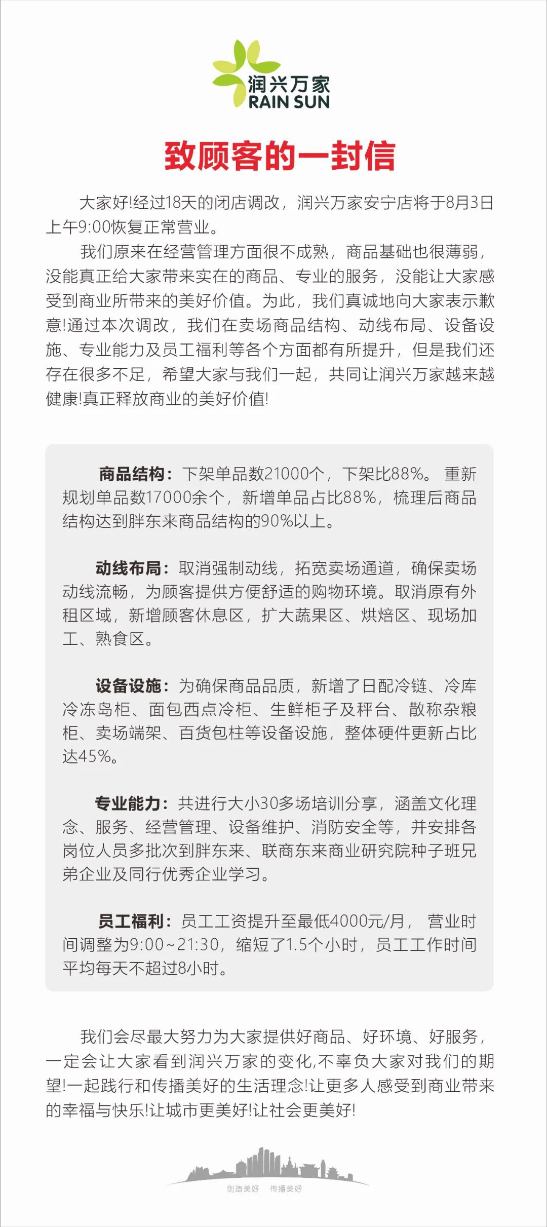 《職業(yè)零售網》獲悉,近日,云南潤興萬家安寧店發(fā)布一封《致顧客的一封信》,經過18天的閉店調改,潤興萬家安寧店已于8月3日正式恢復營業(yè)。 在信中,潤興萬家安寧店深刻反思了原來在經營管理方面很不成熟,商品基礎也很薄弱,沒能真正給大家?guī)韺嵲诘纳唐、專業(yè)的服務,沒能讓大家感受到商業(yè)所帶來的美好價值。為此,我們真誠地向大家表示歉意! 通過本次調改,我們在賣場商品結構、動線布局、設備設施、專業(yè)能力及員工福利等各個方面都有所提升,但是我們還存在很多不足,希望大家與我們一起,共同讓潤興萬家越來越健康!真正釋放商業(yè)的美好價值! 商品結構:下架單品數21000個,下架比88%。重新規(guī)劃單品數17000余個,新增單品占比88%,梳理后商品結構達到胖東來商品結構的90%以上。 動線布局:取消強制動線,拓寬賣場通道,確保賣場動線流暢,為顧客提供方便舒適的購物環(huán)境。取消原有外租區(qū)域,新增顧客休息區(qū),擴大蔬果區(qū)、烘焙區(qū)、現場加工、熟食區(qū)。 設備設施:為確保商品品質,新增了日配冷鏈、冷庫冷凍島柜、面包西點冷柜、生鮮柜子及秤臺、散稱雜糧柜、賣場端架、百貨包柱等設備設施,整體硬件更新占比達45%。 |