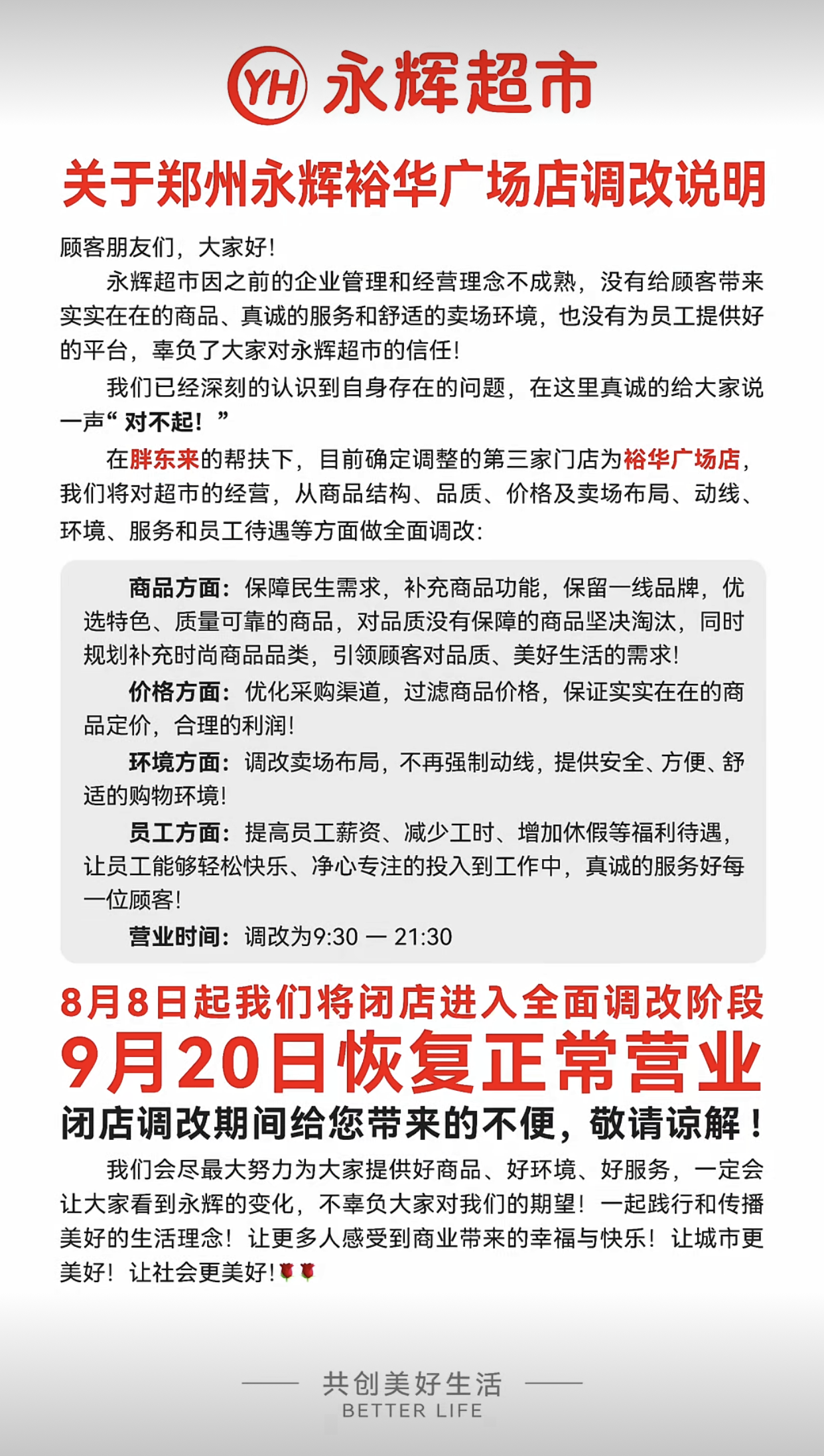 《職業(yè)零售網(wǎng)》獲悉,8月7日,永輝超市河南發(fā)布關(guān)于鄭州永輝裕華廣場(chǎng)店調(diào)改說(shuō)明,該店計(jì)劃于8月8日將閉店進(jìn)入全面調(diào)改階段,將于9月20日正式恢復(fù)營(yíng)業(yè)。 調(diào)改說(shuō)明中指出,因之前的企業(yè)管理和經(jīng)營(yíng)理念不成熟,沒(méi)有給顧客帶來(lái)實(shí)實(shí)在在的商品、真誠(chéng)的服務(wù)和舒適的賣(mài)場(chǎng)環(huán)境,也沒(méi)有為員工提供好的平臺(tái),辜負(fù)了大家對(duì)永輝超市的信任! 我們已經(jīng)深刻的認(rèn)識(shí)到自身存在的問(wèn)題,在這里真誠(chéng)的給大家說(shuō)一聲“對(duì)不起!” 在胖東來(lái)的幫扶下,目前確定調(diào)整的第三家門(mén)店為裕華廣場(chǎng)店我們將對(duì)超市的經(jīng)營(yíng),從商品結(jié)構(gòu)、品質(zhì)、價(jià)格及賣(mài)場(chǎng)布局、動(dòng)線環(huán)境、服務(wù)和員工待遇等方面做全面調(diào)改。 商品方面,保障民生需求,補(bǔ)充商品功能,保留一線品牌,優(yōu)選特色、質(zhì)量可靠的商品,對(duì)品質(zhì)沒(méi)有保障的商品堅(jiān)決淘汰,同時(shí)規(guī)劃補(bǔ)充時(shí)尚商品品類(lèi),引領(lǐng)顧客對(duì)品質(zhì)、美好生活的需求。 價(jià)格方面,優(yōu)化采購(gòu)渠道,過(guò)濾商品價(jià)格,保證實(shí)實(shí)在在的商品定價(jià),合理的利潤(rùn)。 環(huán)境方面,調(diào)改賣(mài)場(chǎng)布局,不再?gòu)?qiáng)制動(dòng)線,提供安全、方便、舒適的購(gòu)物環(huán)境。 員工方面,提高員工薪資、減少工時(shí)、增加休假等福利待遇,讓員工能夠輕松快樂(lè)、凈心專(zhuān)注的投入到工作中,真誠(chéng)的服務(wù)好每位顧客。 營(yíng)業(yè)時(shí)間調(diào)改為9:30 - 21:30。 隨著裕華廣場(chǎng)店的正式敲定,截至目前,胖東來(lái)已幫扶永輝的門(mén)店數(shù)量達(dá)到三家,其中包括已恢復(fù)營(yíng)業(yè)的瀚海海尚店和信萬(wàn)廣場(chǎng)店。 |