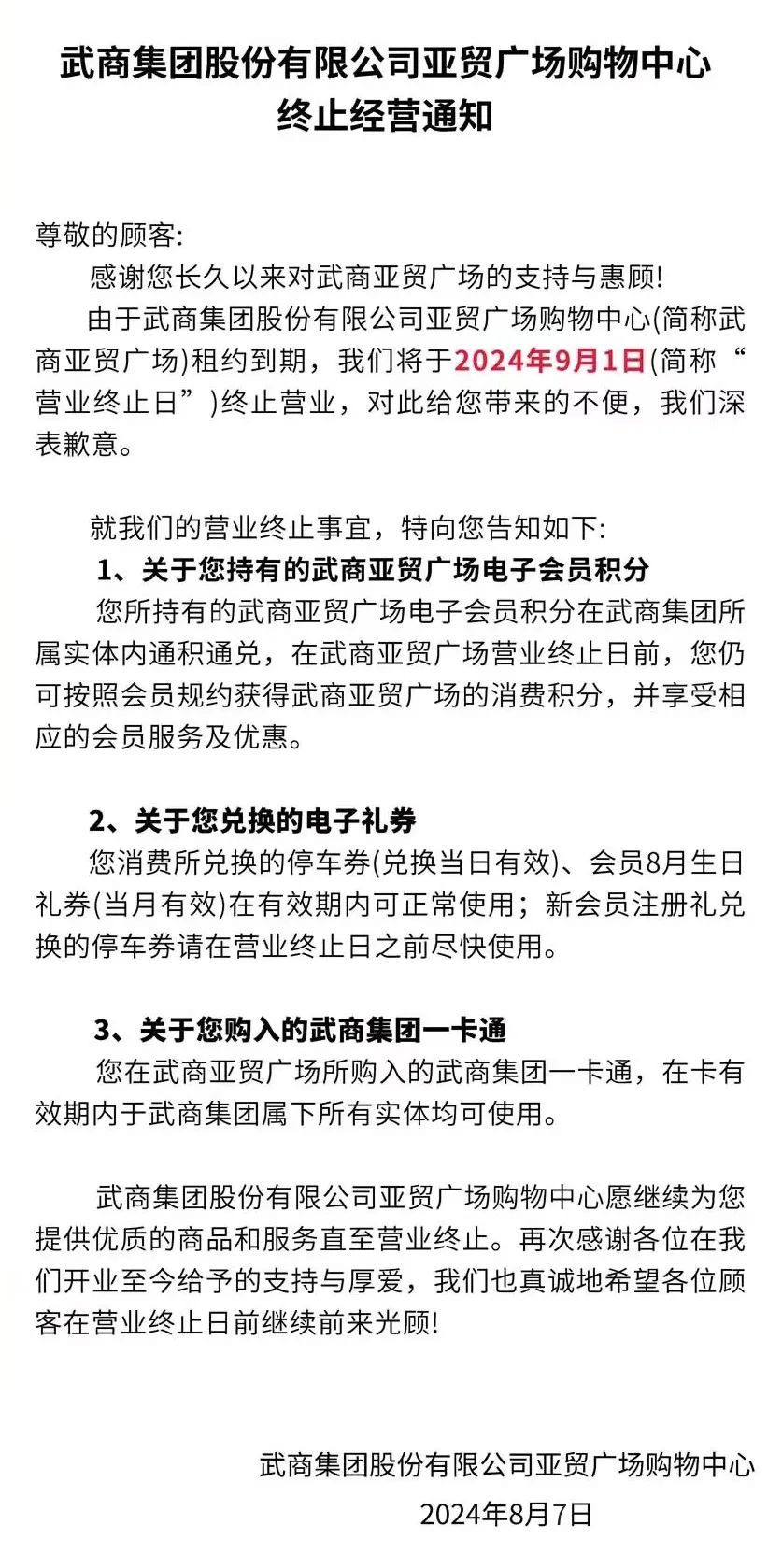 8月7日,武商集團(tuán)亞貿(mào)廣場(chǎng)購(gòu)物中心官微發(fā)布通知:因租約到期,亞貿(mào)廣場(chǎng)將于2024年9月1日終止?fàn)I業(yè),并在相關(guān)業(yè)務(wù)及人員妥善安排后,擬注銷(xiāo)亞貿(mào)廣場(chǎng)。 另外,根據(jù)武商集團(tuán)與武漢市亞洲貿(mào)易廣場(chǎng)股份有限公司(以下簡(jiǎn)稱(chēng)“亞貿(mào)廣場(chǎng)”)分別于2015年5月28日、2019年10月25日簽署的《房屋租賃合同》及《房屋租賃合同》補(bǔ)充協(xié)議,武商集團(tuán)租賃位于武昌區(qū)武珞路628號(hào)的裙樓,由分公司亞貿(mào)廣場(chǎng)進(jìn)行商品經(jīng)營(yíng),租賃期限10年,即2014年9月1日至2024年8月31日。 這也意味著,這家于1998年開(kāi)業(yè),陪伴了28年之久的地標(biāo)性商場(chǎng),將正式退出市場(chǎng)。(化妝品財(cái)經(jīng)在線(xiàn)) |