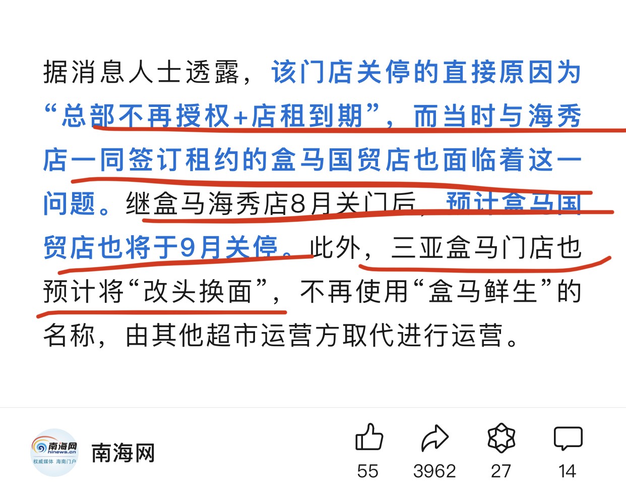 本文來自:贏商網(wǎng),作者:羅嘉欣 繼去年家樂福關(guān)閉海南所有門店后,今年又一家全國連鎖超市品牌即將敗走海島。這一次,被傳關(guān)店的對象是商超界的網(wǎng)紅選手——盒馬鮮生。 據(jù)本地媒體“南海網(wǎng)”報(bào)道,盒馬鮮生app發(fā)布“致盒粉的一封信”,宣布“盒馬鮮生?诤P愕陮⒆2024年8月8日起停止?fàn)I業(yè)”。該店停業(yè)后,盒馬在海南的門店僅剩下海口國貿(mào)店和三亞一方百貨店。據(jù)該媒體報(bào)道,接下來海南剩余的兩家門店也將關(guān)閉,盒馬鮮生或徹底退出海南。 盒馬鮮生折戟海南 盒馬鮮生于2018年開出海南首家門店,2020年開出三亞首店,除開關(guān)店的海秀店,目前在海南剩余2家門店,?1家, 三亞1家。 據(jù)悉,盒馬海秀店關(guān)店早有預(yù)兆,如更早之前門店商品已然不再上新和補(bǔ)充貨源。此次關(guān)店,正好是店鋪?zhàn)饧s到期,盒馬選擇不再續(xù)約。 本土商超巨頭加速擴(kuò)展 目前海南市場上有一批發(fā)展非常優(yōu)秀的本土商超品牌,如走大眾平價(jià)路線的旺佳旺超市、客潤佳超市、兼顧大眾與精品路線的旺豪超市等。 外來商超方面,則有大潤發(fā)、華聯(lián)超市、世紀(jì)華聯(lián)超市、盒馬和ole精品超市。 其中,世紀(jì)華聯(lián)超市進(jìn)入海南市場較早,在三亞和?诠灿(jì)約15家在營門店,門店主要分布在裙樓商業(yè)和街邊物業(yè)為主。華聯(lián)超市則在?诤腿齺喐鏖_了一家門店,最近新開了?谟^瀾湖門店。 大潤發(fā)主要布局在?,在營3家門店。另據(jù)南海網(wǎng)報(bào)道,大潤發(fā)接盤原家樂福南亞廣場店鋪,目前門店進(jìn)入室內(nèi)裝修階段。據(jù)了解到,大潤發(fā)還新簽約了王府井海墾廣場。 華潤萬家旗下ole精品超市,2022年伴隨?谌f象城開業(yè),開出了全島的第一家門店。 從目前海南商超發(fā)展趨勢來看,本土品牌中門店數(shù)量較多的“旺佳旺”主要扎根?,而“旺豪超市”幾乎占據(jù)了?诤腿齺啽就翗(biāo)桿Mall的大半壁江山,發(fā)展勢頭正猛。 比如在?冢磳⒃诮衲9月開業(yè)的龍湖?谔旖帧⒓磳⒂谀甑组_業(yè)的南光中心,均是引進(jìn)的旺豪超市。在三亞,旺豪超市又相繼進(jìn)駐了三亞天悅城和三亞大悅城兩大標(biāo)桿新秀MALL。 |
