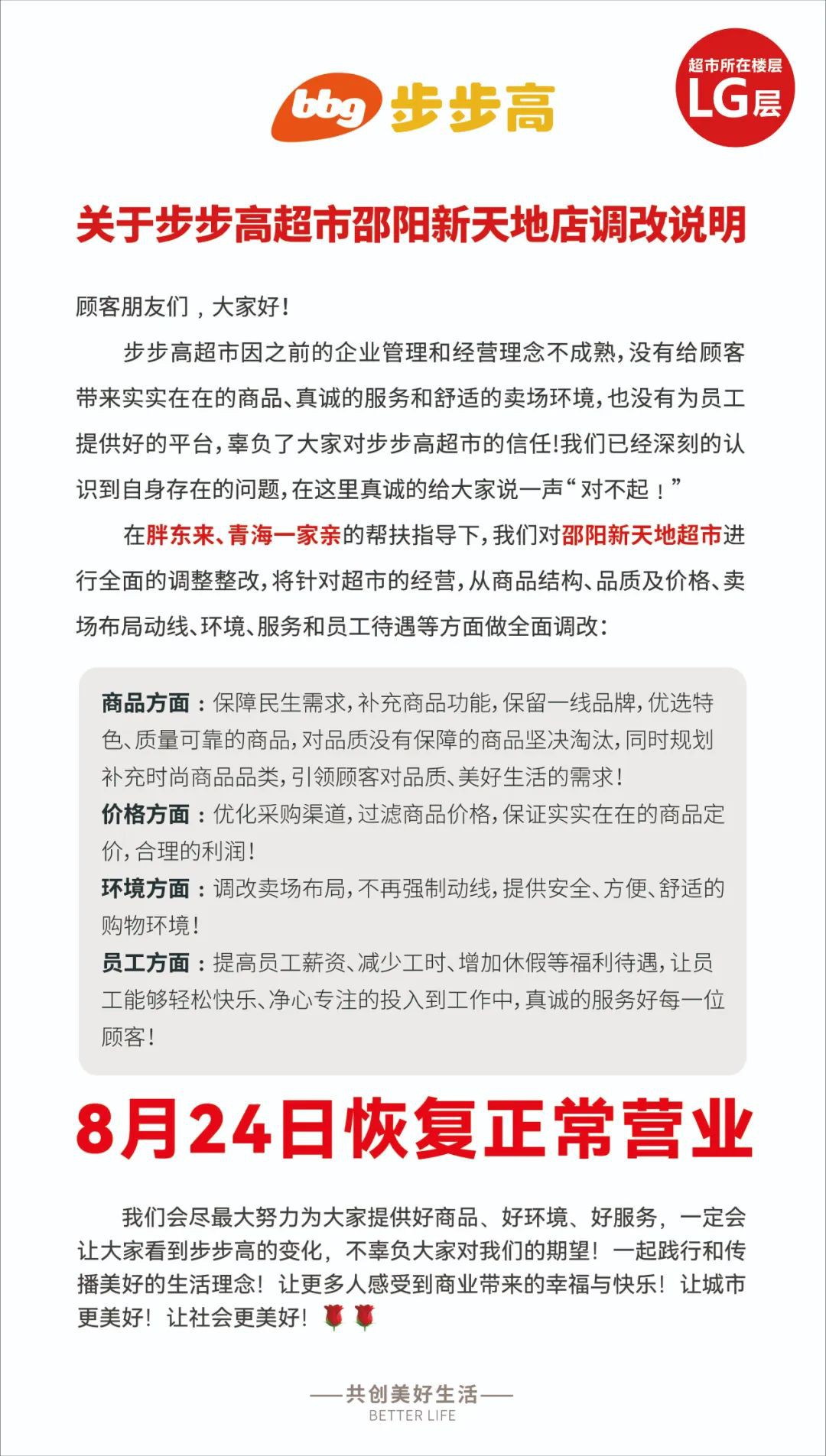 《職業(yè)零售網(wǎng)》獲悉,8月12日,步步高官方發(fā)布消息稱,胖東來幫扶調(diào)改邵陽新天地超市,將于8月24日恢復(fù)正常營業(yè)。這是繼長沙梅溪湖店、湘潭九華新天地店及星城天地店后,胖東來幫扶調(diào)改的第四家門店。 據(jù)悉,步步高新天地位于邵陽市中心城區(qū),坐落在邵陽大道與建設(shè)南路交匯處,此次閉店調(diào)改將根據(jù)超市的經(jīng)營情況,針對(duì)商品結(jié)構(gòu)、品質(zhì)、價(jià)格、賣場(chǎng)布局動(dòng)線、環(huán)境、服務(wù)及員工待遇等方面進(jìn)行全面調(diào)整。 |