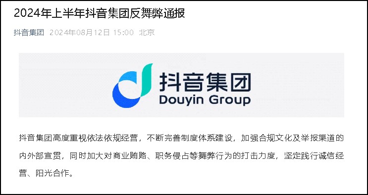 8月12日抖音集團(tuán)發(fā)布“2024年上半年抖音集團(tuán)反舞弊通報(bào)”,明確對(duì)腐敗、賄賂“零容忍”的態(tài)度,堅(jiān)決反對(duì)一切舞弊和失信行為。如發(fā)現(xiàn)違反法律法規(guī)或員工行為準(zhǔn)則的行為,一經(jīng)查實(shí),涉案員工一律辭退處理,永不錄用。 全文如下: 抖音集團(tuán)高度重視依法依規(guī)經(jīng)營,不斷完善制度體系建設(shè),加強(qiáng)合規(guī)文化及舉報(bào)渠道的內(nèi)外部宣貫,同時(shí)加大對(duì)商業(yè)賄賂、職務(wù)侵占等舞弊行為的打擊力度,堅(jiān)定踐行誠信經(jīng)營、陽光合作。 抖音集團(tuán)始終堅(jiān)持對(duì)腐敗、賄賂“零容忍”的態(tài)度,堅(jiān)決反對(duì)一切舞弊和失信行為。如發(fā)現(xiàn)違反法律法規(guī)或員工行為準(zhǔn)則的行為,一經(jīng)查實(shí),涉案員工一律辭退處理,永不錄用。如相關(guān)行為涉嫌違法犯罪,集團(tuán)將嚴(yán)格按照國家法律法規(guī),全力配合司法機(jī)關(guān)調(diào)查,追究涉案人員的法律責(zé)任。希望所有員工和合作伙伴遵守規(guī)則,共同維護(hù)陽光、誠信的商業(yè)生態(tài)。 2024年上半年,抖音集團(tuán)共查處舞弊類違規(guī)案件125起,其中88人因觸犯廉潔紅線被辭退,17人因涉嫌違法犯罪被移送司法機(jī)關(guān)處理,F(xiàn)將2024年上半年因商業(yè)賄賂、舞弊或職務(wù)侵占被移送司法的案件通報(bào)如下: 1、電商前員工李某、朱某、許某利用職務(wù)便利,為外部達(dá)人或服務(wù)商謀取不當(dāng)利益,并收受好處費(fèi)。其行為違反了員工行為準(zhǔn)則,集團(tuán)已將3人辭退。同時(shí),該3人涉嫌違法犯罪,已被移送公安機(jī)關(guān)處理。 2、抖音前員工陸某、程某(案發(fā)前已離職)利用職務(wù)便利,收受外部合作商好處費(fèi)。其行為違反了員工行為準(zhǔn)則,集團(tuán)已將陸某辭退。同時(shí),該2人因涉嫌違法犯罪,已被移送公安機(jī)關(guān)處理。 3、抖音前員工周某利用職務(wù)便利,為外部主播提供不當(dāng)幫助,并收受好處費(fèi)。其行為違反了員工行為準(zhǔn)則,集團(tuán)已將其辭退。同時(shí),周某因涉嫌違法犯罪,已被移送公安機(jī)關(guān)處理。 4、生活服務(wù)前員工高某利用職務(wù)便利,違規(guī)引入服務(wù)商,并收受好處費(fèi)。其行為違反了員工行為準(zhǔn)則,集團(tuán)已將其辭退。同時(shí),高某因涉嫌違法犯罪,已被移送公安機(jī)關(guān)處理。 5、生活服務(wù)前員工程某利用職務(wù)便利,為外部服務(wù)商謀取提供不當(dāng)幫助,并收受好處費(fèi)。其行為違反了員工行為準(zhǔn)則,集團(tuán)已將其辭退。同時(shí),程某因涉嫌違法犯罪,已被移送公安機(jī)關(guān)處理。 6、生活服務(wù)前員工孟某、侯某、單某、劉某、常某、吳某和于某等人利用職務(wù)便利,為外部商家提供不當(dāng)幫助,非法侵占集團(tuán)資產(chǎn)。其行為違反了員工行為準(zhǔn)則,集團(tuán)已將7人辭退。同時(shí),該7人因涉嫌違法犯罪,已被移送公安機(jī)關(guān)處理。 7、產(chǎn)品研發(fā)及工程架構(gòu)前員工曹某利用職務(wù)便利,聯(lián)合外部人員謀取私利。其行為違反了員工行為準(zhǔn)則,集團(tuán)已將其辭退。同時(shí),曹某因涉嫌違法犯罪,已被移送公安機(jī)關(guān)處理。 8、中國銷售業(yè)務(wù)平臺(tái)前員工廖某利用職務(wù)便利,為外部代理商謀取不當(dāng)利益,并收受好處費(fèi)。其行為違反了員工行為準(zhǔn)則,集團(tuán)已將其辭退。同時(shí),廖某因涉嫌違法犯罪,已被移送公安機(jī)關(guān)處理。 |