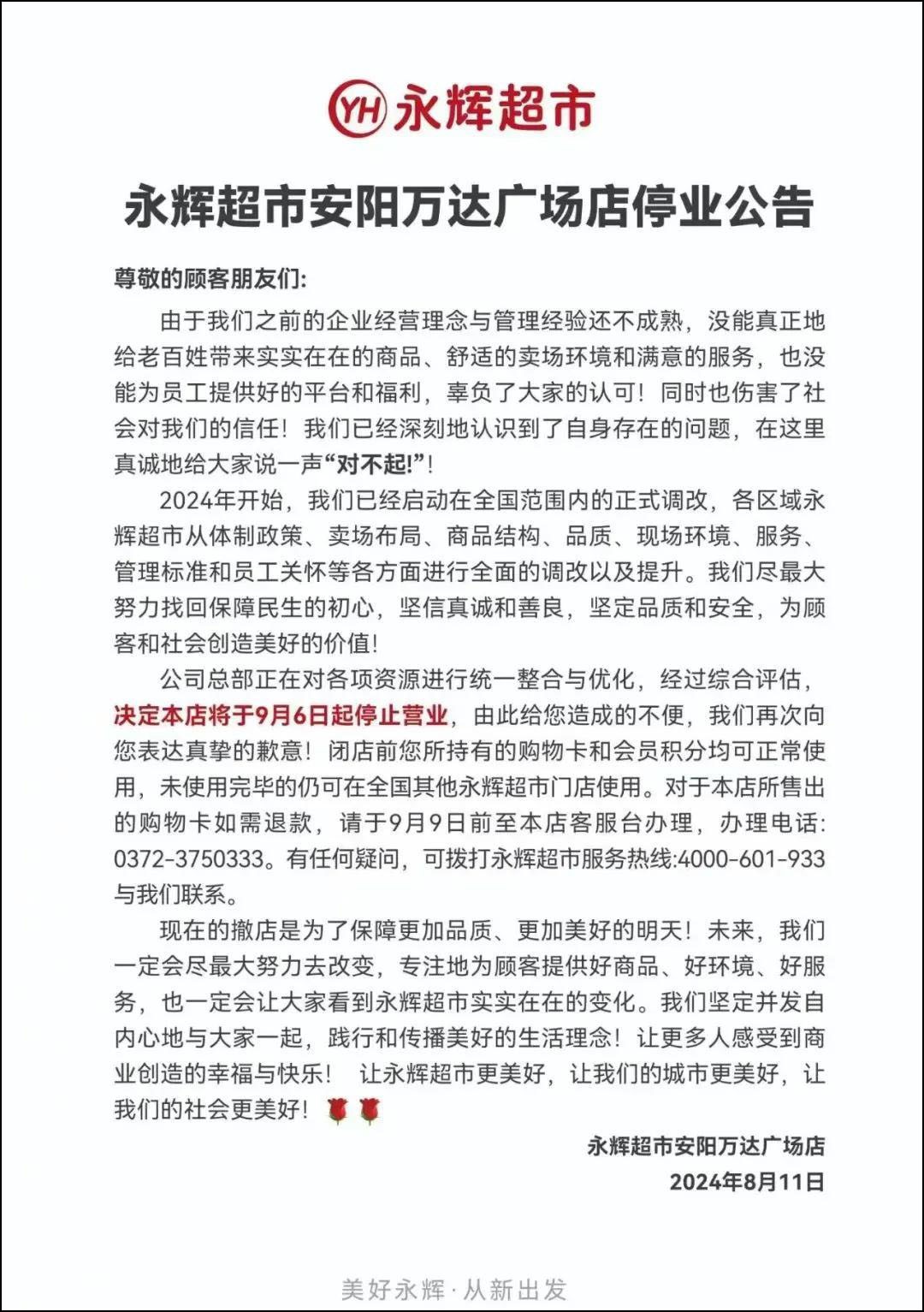《職業(yè)零售網(wǎng)》獲悉,近日,永輝超市安陽萬達廣場店發(fā)布停業(yè)通知,宣布將于9月6日起停止營業(yè)。 通知中表示,由于我們之前的企業(yè)經(jīng)營理念與管理經(jīng)驗還不成熟,沒能真正地給老百姓帶來實實在在的商品、舒適的賣場環(huán)境和滿意的服務(wù),也沒能為員工提供好的平臺和福利,辜負了大家的認可!同時也傷害了社會對我們的信任!我們已經(jīng)深刻地認識到了自身存在的問題,在這里真誠地給大家說一聲“對不起!”! 2024年開始,我們已經(jīng)啟動在全國范圍內(nèi)的正式調(diào)改,各區(qū)域永輝超市從體制政策、賣場布局、商品結(jié)構(gòu)、品質(zhì)、現(xiàn)場環(huán)境、服務(wù)、管理標準和員工關(guān)懷等各方面進行全面的調(diào)改以及提升。我們盡最大努力找回保障民生的初心,堅信真誠和善良,堅定品質(zhì)和安全,為顧客和社會創(chuàng)造美好的價值! 公司總部正在對各項資源進行統(tǒng)一整合與優(yōu)化,經(jīng)過綜合評估,決定本店將于9月6日起停止營業(yè),由此給您造成的不便,我們再次向您表達真摯的歉意!閉店前您所持有的購物卡和會員積分均可正常使用,未使用完畢的仍可在全國其他永輝超市門店使用。 資料顯示,永輝超市安陽萬達廣場店于2015年7月開業(yè),開業(yè)至今已有9年之久。這是永輝在安陽市的第一家門店,也是永輝超市在河南省的第12家門店,總面積9000多平方米,擁有3萬多種單品。如今突然關(guān)店,讓人唏噓不已。 |