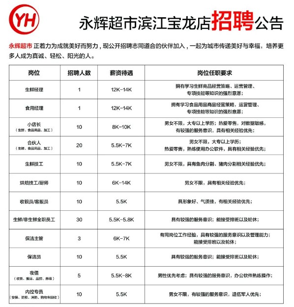 《職業(yè)零售網》獲悉,8月21日,永輝招聘官方公眾號發(fā)了一則關于杭州濱江寶龍店招聘公告。 公告中顯示,該店計劃招聘120人,薪資待遇范圍在5500元到14000元不等,涵蓋了生鮮經理、食用經理、生鮮/食品用品/加工、生鮮技工、收銀/客服員、烘焙技工/廚師、保潔員/主管等多個崗位。 福利待遇方面,員工除了可以享受員工餐、五險一金、全薪年假、產假、節(jié)假日福利卡發(fā)放外,還享有員工內部折扣等額外待遇。 |