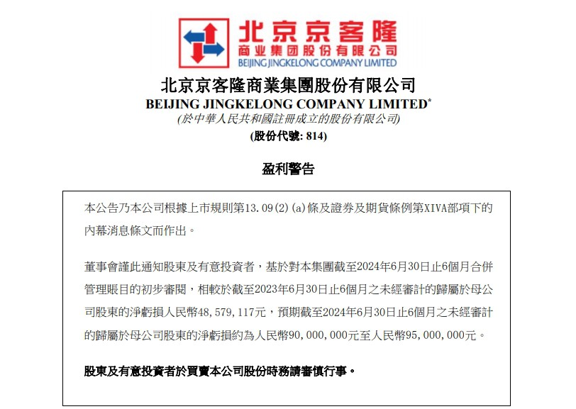 8月22日,北京京客隆發(fā)布盈利警告顯示,相較于截至2023年6月30日止6個月未經(jīng)審計的歸屬于母公司股東的凈虧損約4857.9萬元,預(yù)期截至2024年6月30日止6個月未經(jīng)審計的歸屬于母公司股東的凈虧損約為9000萬元至9500萬元。 北京京客隆表示,造成歸屬于母公司股東的凈虧損增加的主要原因是,截至2024年6月30日止6個月期間,受主要出租方北京朝富國有資產(chǎn)管理有限公司等大幅漲租影響,集團(tuán)租賃成本顯著增加。 |