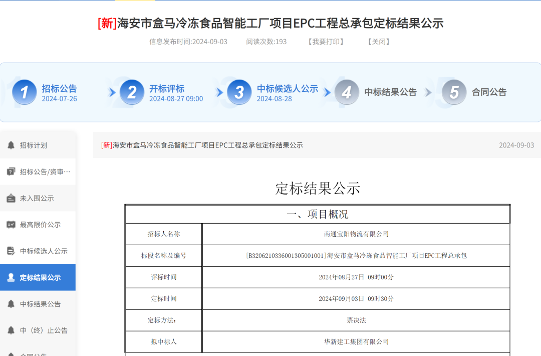近日,南通市公共資源交易平臺最新消息顯示,海安市盒馬冷凍食品智能工廠項目EPC工程總承包定標結(jié)果公示顯示,華新建工集團有限公司中標。 盒馬(中國)有限公司是阿里巴巴集團旗下的新零售平臺。此次與海安市達成戰(zhàn)略合作,計劃投資超20億元,在建設(shè)盒馬食品智能產(chǎn)業(yè)園、打造“盒馬村”等方面開展積極協(xié)作。 簽約的冷凍面食智能工廠項目,將采購全自動化生產(chǎn)線,打造盒馬垂直供應(yīng)鏈體系建設(shè)的標志項目。盒馬還將引進產(chǎn)業(yè)鏈配套頭部企業(yè),攜手海安建設(shè)華東區(qū)域最大的冷凍食品智能生產(chǎn)基地。 |