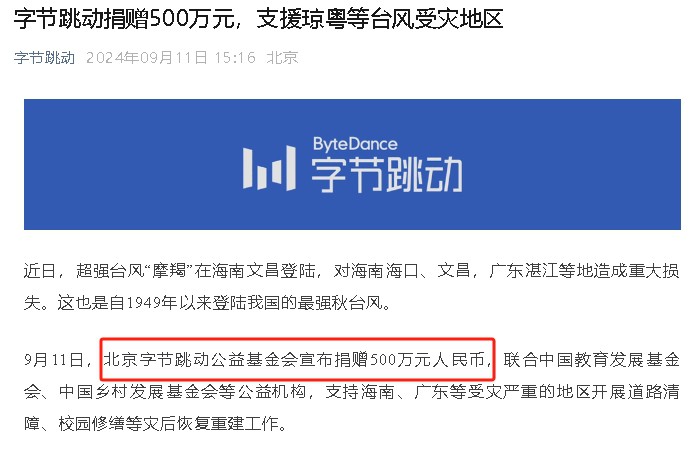近日,超強(qiáng)臺風(fēng)“摩羯”在海南文昌登陸,對海南?、文昌,廣東湛江等地造成重大損失。這也是自1949年以來登陸我國的最強(qiáng)秋臺風(fēng)。 9月11日,北京字節(jié)跳動公益基金會宣布捐贈500萬元人民幣,聯(lián)合中國教育發(fā)展基金會、中國鄉(xiāng)村發(fā)展基金會等公益機(jī)構(gòu),支持海南、廣東等受災(zāi)嚴(yán)重的地區(qū)開展道路清障、校園修繕等災(zāi)后恢復(fù)重建工作。 字節(jié)跳動公益平臺同步啟動應(yīng)急響應(yīng)機(jī)制,上線相關(guān)救災(zāi)公益項(xiàng)目,開展專題籌款,增加捐贈入口,支援應(yīng)急救災(zāi)工作。風(fēng)雨同舟,讓我們共助受災(zāi)地區(qū)度過難關(guān)。 |