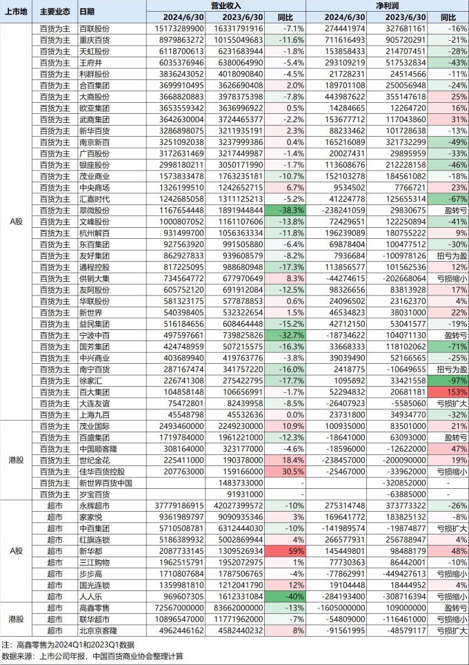 9月13日,中國百貨商業(yè)協(xié)會發(fā)布了“大型零售企業(yè)發(fā)展指數(shù)”2024Q2數(shù)據(jù)。 整體上來看,大型零售企業(yè)的營業(yè)收入仍在下降,盈利狀況有進(jìn)一步下降趨勢,消費(fèi)仍待進(jìn)一步恢復(fù),企業(yè)經(jīng)營壓力較大。 其中,以百貨業(yè)態(tài)為主的大型零售企業(yè)營業(yè)收入和盈利均面臨挑戰(zhàn),其作為一個整體還是勉強(qiáng)保持盈利狀態(tài),但盈利處于歷史上的最低水平。超市業(yè)態(tài)營收自2020年第四季度開始一直在下降,作為一個整體近兩年持續(xù)處于虧損狀態(tài),進(jìn)入2024第二季度,虧損有擴(kuò)大跡象。 大型零售企業(yè)綜合業(yè)態(tài)營業(yè)收入指數(shù)及凈利潤指數(shù) “大型零售企業(yè)綜合業(yè)態(tài)營業(yè)收入指數(shù)”顯示,2024年Q2指數(shù)為1312點,繼續(xù)下降,較上期下降了2.9%,較去年同期下降了6.2%。趨勢上看,從2018年第一季度以來,大型零售企業(yè)的營業(yè)收入持續(xù)呈現(xiàn)下行趨勢。 “大型零售企業(yè)凈利潤指數(shù)”顯示,當(dāng)前大型零售企業(yè)作為一個整體仍然是虧損狀態(tài),最新指數(shù)是-102點。2023年整體呈現(xiàn)盈利改善狀態(tài),但進(jìn)入2024年,虧損又開始擴(kuò)大,第二季度顯示有加速擴(kuò)大跡象,企業(yè)盈利壓力越來越大。 虧損主要來自于超市業(yè)態(tài)的企業(yè),其中部分企業(yè)虧損額較大,使得整個大型零售企業(yè)作為一個整體呈現(xiàn)虧損狀態(tài),同時2024年上半年百貨業(yè)態(tài)為主的企業(yè)凈利潤也明顯下降。 大型百貨零售企業(yè)營業(yè)收入指數(shù)及凈利潤指數(shù) “大型百貨零售企業(yè)營業(yè)收入指數(shù)”,樣本主要以百貨零售為主,但大部分企業(yè)除了百貨業(yè)態(tài)外,還經(jīng)營超市、購物中心等其他業(yè)態(tài)。因上市公司年報數(shù)據(jù)多數(shù)不按業(yè)態(tài)拆分公布,因此,該指數(shù)代表以百貨為主的綜合業(yè)態(tài)零售企業(yè),不僅僅是百貨業(yè)態(tài)。 數(shù)據(jù)顯示,營業(yè)收入經(jīng)過2023年小幅回升后,進(jìn)入2024年繼續(xù)轉(zhuǎn)為下滑,2024年第二季度指數(shù)為1220點,較上期下降了1.6%,較去年同期下降了2.3%。 “大型百貨零售企業(yè)凈利潤指數(shù)”顯示,2024年第二季度,凈利潤指數(shù)為5點,是指數(shù)計算以來的最低值。總體上看,大型百貨企業(yè)的盈利水平處在歷史最低水平。 大型超市營業(yè)收入指數(shù)及凈利潤指數(shù) “大型超市企業(yè)營業(yè)收入指數(shù)”顯示,2024年Q2營業(yè)收入322點,較上期下降3.8%,較去年同期下降8.9%,超市業(yè)態(tài)營業(yè)收入自2020年第二季度以來,總體呈現(xiàn)下行趨勢,暫無好轉(zhuǎn)跡象。 “大型超市企業(yè)凈利潤指數(shù)”顯示,大型超市作為一個整體,凈利潤在2020年底達(dá)到歷史頂點,隨后出現(xiàn)斷崖式下降,自2021年第三季度以來一直處于虧損狀態(tài)。2024年第一季度為-268點,較2022年第四季度有明顯改善。但進(jìn)入2024年第二季度,盈利狀況變差,當(dāng)前點位-350,虧損擴(kuò)大。 附:2024上半年主要樣本營業(yè)收入及凈利潤情況 |