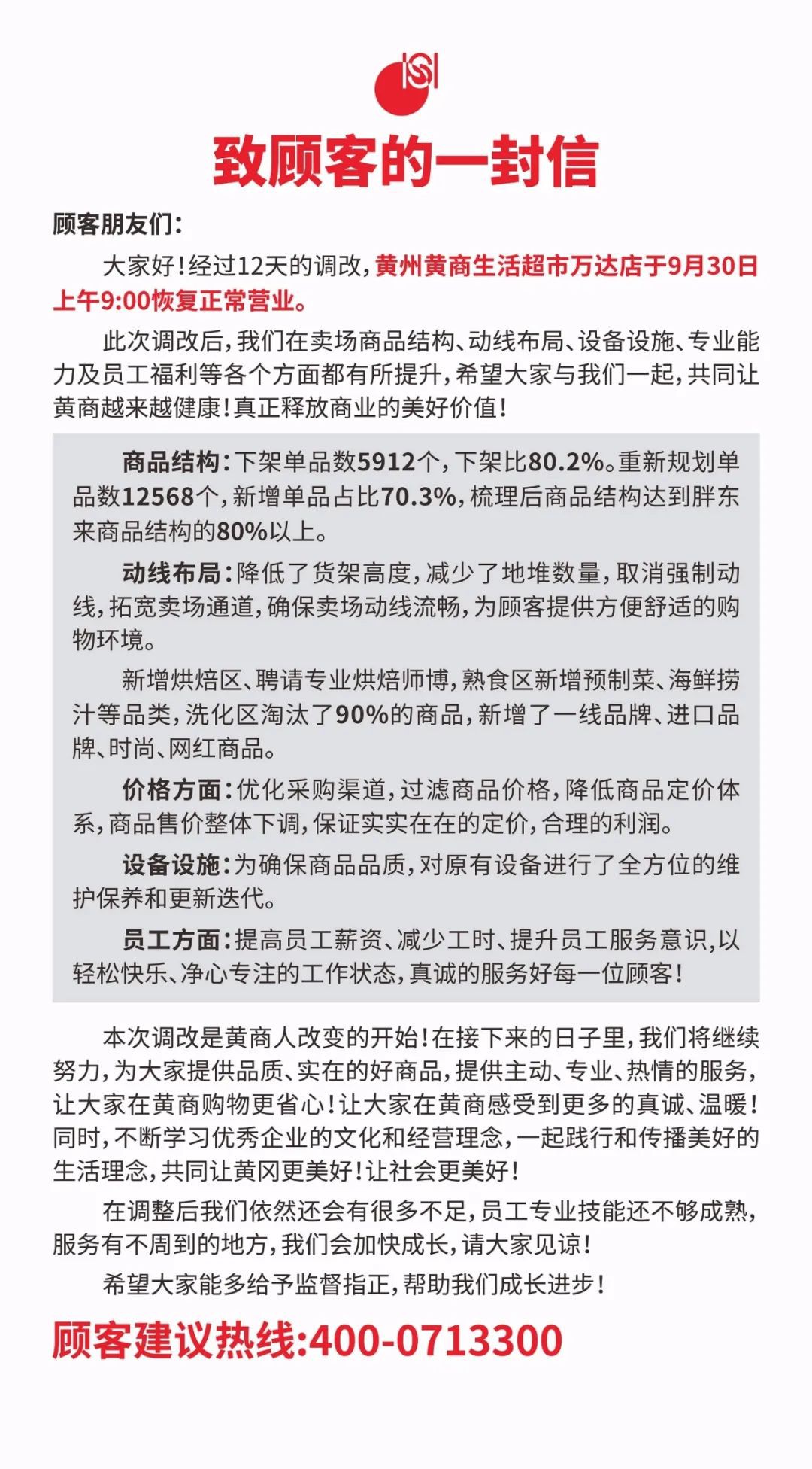 《職業(yè)零售網(wǎng)》獲悉,9月29日,黃商集團(tuán)發(fā)布《顧客信》稱(chēng),經(jīng)過(guò)12天的調(diào)改,黃州黃商生活超市萬(wàn)達(dá)店今天(9月30日上午9:00)恢復(fù)正常營(yíng)業(yè)。 此次調(diào)改后,我們?cè)谫u(mài)場(chǎng)商品結(jié)構(gòu)、動(dòng)線布局、設(shè)備設(shè)施、專(zhuān)業(yè)能力及員工福利等各個(gè)方面都有所提升,希望大家與我們一起,共同讓黃商越來(lái)越健康!真正釋放商業(yè)的美好價(jià)值! 商品結(jié)構(gòu):下架單品數(shù)5912個(gè),下架比80.2%。重新規(guī)劃單品數(shù)12568個(gè),新增單品占比70.3%,梳理后商品結(jié)構(gòu)達(dá)到胖東來(lái)商品結(jié)構(gòu)的80%以上。 動(dòng)線布局:降低了貨架高度,減少了地堆數(shù)量,取消強(qiáng)制動(dòng)線,拓寬賣(mài)場(chǎng)通道,確保賣(mài)場(chǎng)動(dòng)線流暢,為顧客提供方便舒適的購(gòu)物環(huán)境。新增烘焙區(qū)、聘請(qǐng)專(zhuān)業(yè)烘焙師博,熟食區(qū)新增預(yù)制菜、海鮮撈汁等品類(lèi),洗化區(qū)淘汰了90%的商品,新增了一線品牌、進(jìn)口品牌、時(shí)尚、網(wǎng)紅商品。 價(jià)格方面:優(yōu)化采購(gòu)渠道,過(guò)濾商品價(jià)格,降低商品定價(jià)體系,商品售價(jià)整體下調(diào),保證實(shí)實(shí)在在的定價(jià),合理的利潤(rùn)。 設(shè)備設(shè)施:為確保商品品質(zhì),對(duì)原有設(shè)備進(jìn)行了全方位的維護(hù)保養(yǎng)和更新迭代。 員工方面:提高員工薪資、減少工時(shí)、提升員工服務(wù)意識(shí),以輕松快樂(lè)、凈心專(zhuān)注的工作狀態(tài),真誠(chéng)的服務(wù)好每一位顧客! 本次調(diào)改是黃商人改變的開(kāi)始!在接下來(lái)的日子里,我們將繼續(xù)努力,為大家提供品質(zhì)、實(shí)在的好商品,提供主動(dòng)、專(zhuān)業(yè)、熱情的服務(wù),讓大家在黃商購(gòu)物更省心!讓大家在黃商感受到更多的真誠(chéng)、溫暖! |
