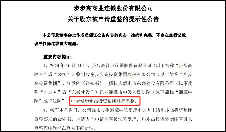 10月11日,*ST步高(002251)母公司步步高投資集團(tuán)股份有限公司新增一則破產(chǎn)審查案件,申請人為韶山市東興建設(shè)有限公司,經(jīng)辦法院為湖南省湘潭市中級人民法院。 步步高投資集團(tuán)股份有限公司成立于2003年2月,法定代表人為王填,注冊資本約12.2億人民幣,經(jīng)營范圍含企業(yè)管理咨詢服務(wù)、房地產(chǎn)信息咨詢服務(wù)、商務(wù)信息咨詢服務(wù)、商務(wù)代理代辦服務(wù)、物業(yè)管理、倉儲保管等,由王填、張海霞、聯(lián)志投資有限公司等共同持股。風(fēng)險信息顯示,該公司現(xiàn)存4條被執(zhí)行人信息,被執(zhí)行總金額超3億元。 |