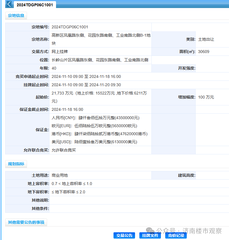 9月25日,山姆會員店濟南首店落子高新區(qū)得到官宣。一個月后,又有新消息。 濟南山姆會員店建設(shè)用地掛牌,占地面積3.06公頃,位于長嶺山片區(qū)鳳凰路東側(cè)、花園東路南側(cè)、工業(yè)南路北側(cè),掛牌文件明確要求土地競得人須引入一家2023年營業(yè)收入不低于1000億美元的全球零售企業(yè)或其關(guān)聯(lián)公司在地塊內(nèi)設(shè)立大型商超項目。 據(jù)此前媒體報道,濟南高新控股集團有限公司與沃爾瑪(中國)投資有限公司就開發(fā)濟南山姆會員店項目達成協(xié)議。項目規(guī)劃地上建筑面積約2.3萬平方米,地下約5.6萬平方米,預(yù)計2026年底前開業(yè)。在2024《財富》世界500強排行榜上,零售巨頭沃爾瑪以6481億美元總營收登頂。 根據(jù)掛牌文件,高新區(qū)鳳凰路東側(cè)、花園東路南側(cè)、工業(yè)南路北側(cè)B-1地塊規(guī)劃用地性質(zhì)為商業(yè)用地,規(guī)劃建設(shè)用地地上容積率大于0.7、不大于1.0,地下容積率最大2.0,出讓年限40年,出讓起始價21733萬元。該項目總投資不低于5億元,在《土地出讓合同》簽署后1年內(nèi)開工,開工后3年內(nèi)竣工。 |