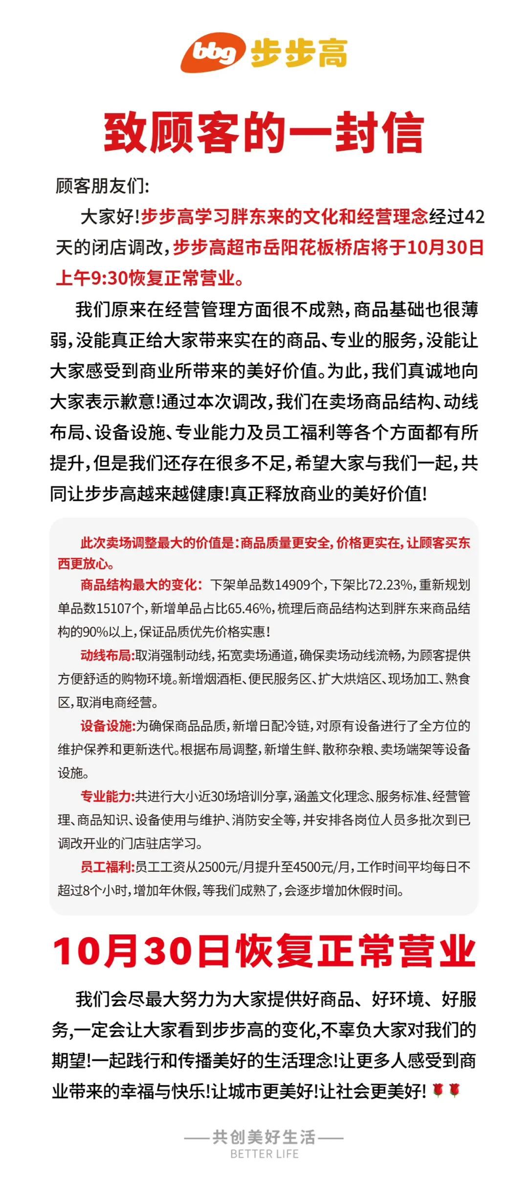 《職業(yè)零售網(wǎng)》獲悉,學(xué)習(xí)胖東來文化與經(jīng)營(yíng)管理理念,經(jīng)過42天的閉店調(diào)改,步步高超市岳陽花板橋店將于10月30日恢復(fù)營(yíng)業(yè),這是其調(diào)改店的第7家門店。 此次賣場(chǎng)調(diào)整最大的價(jià)值是:商品質(zhì)量更安全,價(jià)格更實(shí)在,讓顧客買東西更放心。 商品結(jié)構(gòu)最大的變化:下架單品數(shù)14909個(gè),下架比72.23%,重新規(guī)劃單品數(shù)15107個(gè),新增單品占比65.46%,梳理后商品結(jié)構(gòu)達(dá)到胖東來商品結(jié)構(gòu)的90%以上,保證品質(zhì)優(yōu)先價(jià)格實(shí)惠! 動(dòng)線布局:取消強(qiáng)制動(dòng)線,拓寬賣場(chǎng)通道,確保賣場(chǎng)動(dòng)線流暢,為顧客提傳方便舒適的購物環(huán)境。新增煙酒柜、便民服務(wù)區(qū)、擴(kuò)大烘焙區(qū)、現(xiàn)場(chǎng)加工、熟食區(qū),取消電商經(jīng)營(yíng)。 設(shè)備設(shè)施:為確保商品品質(zhì),新增日配冷鏈,對(duì)原有設(shè)備進(jìn)行了全方位的維護(hù)保養(yǎng)和更新迭代。根據(jù)布局調(diào)整,新增生鮮、散稱雜糧、賣場(chǎng)端架等設(shè)備設(shè)施。 專業(yè)能力:共進(jìn)行大小近30場(chǎng)培訓(xùn)分享,涵蓋文化理念、服務(wù)標(biāo)準(zhǔn)、經(jīng)營(yíng)管理、商品知識(shí)、設(shè)備使用與維護(hù)、消防安全等,并安排各崗位人員多批次到已調(diào)改開業(yè)的門店駐店學(xué)習(xí)。 員工福利:?jiǎn)T工工資從2500元/月提升至4500元/月,工作時(shí)間平均每日不超過8個(gè)小時(shí),增加年休假,等我們成熟了,會(huì)逐步增加休假時(shí)間。 |