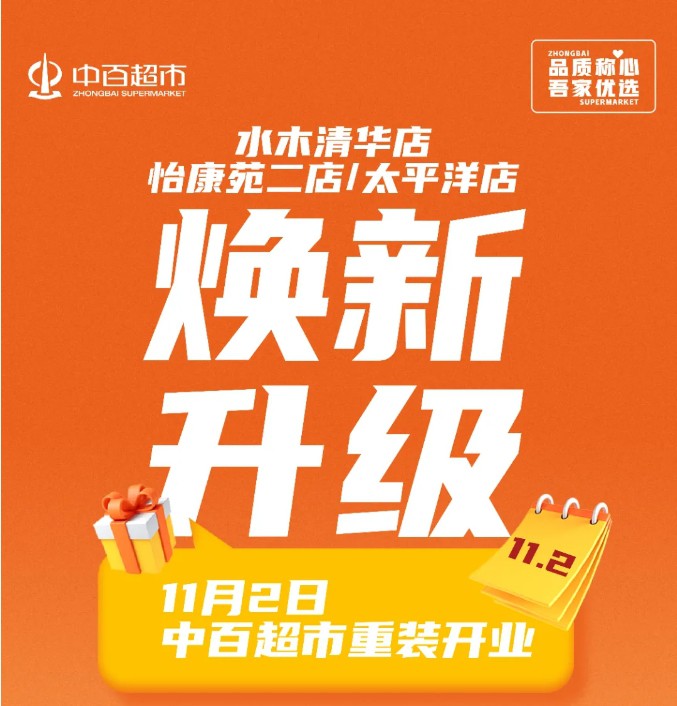 10月31日,中百超市宣布10家新店煥新升級。11月2日,怡康苑二店、太平洋和水木清華店重裝開業(yè);11月7日,金融花園店和武鐵佳苑店開業(yè);11月8日,君融天湖二店額名都花園店開業(yè);11月9日,中交江錦灣二店開業(yè);11月14日,保利時代店開業(yè);11月,月湖琴聲店開業(yè)。 |