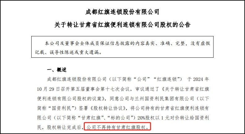 10月29日晚間,紅旗連鎖發(fā)布公告稱,同意公司與蘭州國資利民集團有限公司(以下簡稱“國資利民”)簽署《股權(quán)轉(zhuǎn)讓協(xié)議》,將公司持有的甘肅省紅旗便利連鎖有限公司(以下簡稱“甘肅紅旗”)20%股權(quán)以1元對價轉(zhuǎn)讓給國資利民,股權(quán)轉(zhuǎn)讓完成后,公司不再持有甘肅紅旗股權(quán)。 2020年,為支持國有企業(yè)在零售行業(yè)的發(fā)展,紅旗連鎖入股成立甘肅紅旗(紅旗連鎖以信息管理系統(tǒng)使用權(quán)、管理團隊和模式、供應(yīng)鏈平臺輸出作價出資,并未實際以人民幣出資),甘肅紅旗成立后,紅旗連鎖將模式成功復(fù)制給甘肅紅旗。模式復(fù)制成功后,紅旗連鎖在一定時期內(nèi)將前期搭建人員撤回,后續(xù)全部由對方獨立經(jīng)營。 但經(jīng)過幾年的運營,未能取得顯著成效,導(dǎo)致甘肅紅旗不能實現(xiàn)雙方預(yù)期的各項目標(biāo),由于經(jīng)營狀況持續(xù)惡化,甘肅紅旗也急需謀求新的發(fā)展出路,經(jīng)雙方友好協(xié)商,公司將持有的甘肅紅旗20%的股權(quán)轉(zhuǎn)讓給國資利民,象征性收取1元股權(quán)轉(zhuǎn)讓款,以期助力甘肅紅旗平緩度過困難時期并加快轉(zhuǎn)型。 甘肅紅旗以2024年6月30日為評估基準(zhǔn)日對目前經(jīng)營狀況進行評估,凈資產(chǎn)賬面價值為-356.60萬元,凈資產(chǎn)評估價值為-260.45萬元。此次轉(zhuǎn)讓及時剝離了不良資產(chǎn),不會損害紅旗連鎖自身利益。 與此同時,紅旗連鎖今日晚間發(fā)布的三季度報告顯示,2024年第三季度歸屬于母公司所有者的凈利潤1.23億元,同比下降17.91%;營業(yè)收入25.81億元,同比下降2.17%。 報告期內(nèi),紅旗連鎖1至9月實現(xiàn)含稅主營收入86.99億元,較去年同期增長1.77%。另外,實現(xiàn)增值業(yè)務(wù)收入22.68億元。實現(xiàn)歸屬于公司股東凈利潤3.9億元,其中公司主營業(yè)務(wù)凈利潤3.04億元,同比增長1.21%。投資新網(wǎng)銀行及甘肅紅旗實現(xiàn)投資收益8584.41萬元。 |