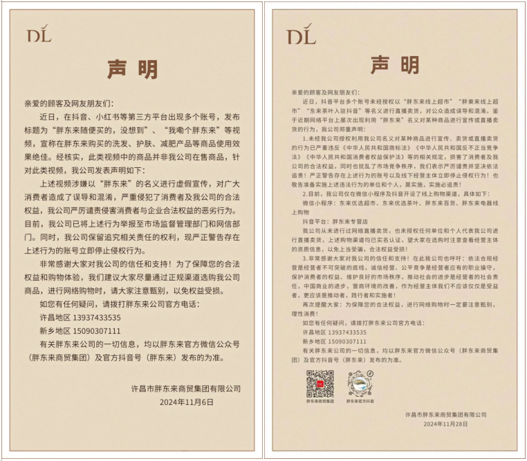 12月1日,許昌市胖東來商貿(mào)集團發(fā)布聲明稱,近日,網(wǎng)絡平臺出現(xiàn)大量利用胖東來視頻進行直播帶貨的情形,此行為對公眾造成嚴重的誤導和混淆,并侵犯了大家的合法權(quán)益,同時破壞了網(wǎng)絡生態(tài)的健康和秩序。 聲明中稱,胖東來未進行任何網(wǎng)絡平臺直播帶貨,也未授權(quán)任何單位和個人代表該公司進行直播帶貨,請大家切記:在網(wǎng)絡上瀏覽信息時注意甄別,對于網(wǎng)絡上未經(jīng)授權(quán)的內(nèi)容保持警惕,避免被誤導、不要上當受騙! 圖來源:胖東來商貿(mào)集團。 據(jù)悉,這已是胖東來近期針對此情況發(fā)布的第三份聲明,前兩份聲明分別發(fā)布于11月6日和11月28日。 在聲明中,胖東來請社會各界以及法律界的專業(yè)朋友們出出主意,提出好的解決辦法和建議,共同維護健康、文明的社會環(huán)境。 針對這一現(xiàn)象,網(wǎng)友們也紛紛提出了自己的建議。有的網(wǎng)友認為胖東來應自行開展直播帶貨活動,以應對市場亂象;還有的網(wǎng)友則建議設立獎項,鼓勵廣大網(wǎng)友積極舉報非法帶貨直播行為。 圖來源:網(wǎng)友評論。 小編也認為,對侵犯企業(yè)合法權(quán)益的虛假網(wǎng)絡直播要重拳出擊,讓違法成本超過利潤,這樣才能對他們進行徹底打擊。 另外,胖東來創(chuàng)始人于東來當日早間也在其社交平臺上發(fā)布提醒:“不要利用胖東來的直播視頻進行賣貨騙人、靠自己的能力慢慢的提升自己的創(chuàng)造價值的技術(shù)能力、做一個真誠美麗的自己!” 于東來提醒大家:“請大家切記!胖東來不會在網(wǎng)上直播帶貨!網(wǎng)友們不要上當!” 圖來源:胖東來于東來。 在食品安全信任問題日益凸顯的背景下,胖東來憑借卓越的品質(zhì)和口碑,贏得了消費者的廣泛信賴和支持。 據(jù)胖東來創(chuàng)始人于東來在其社交媒體上公布的經(jīng)營情況顯示,截至11月26日,本年度胖東來集團累計銷售(許昌新鄉(xiāng)兩地)已達146.38億元,其中胖東來時代廣場店位居銷售榜首,今年累計銷售額達38.69億元。而本月累計銷售(許昌新鄉(xiāng)兩地)達11.94億元。 按胖東來商貿(mào)集團周二不營業(yè)核算,迄今為止283個工作日,胖東來日均營業(yè)額達5172萬元,平均到15家營業(yè)場所(含實業(yè)外銷和線上商城),日均營業(yè)額達344萬元。據(jù)此預測,胖東來今年有望實現(xiàn)160億元的銷售。 此外,胖東來董事長于東來還分享了公司自有品牌的發(fā)展情況。目前,胖東來自有品牌SKU已達100多個,銷售額高達11億元,自有品牌銷售額(含央廚)占比達到30%,其中四個單品銷售額更是過億。于東來預計,未來三年胖東來自有品牌的銷售占比將至少突破50%。他表示,胖東來將從今年開始,用五年的時間分類開發(fā)商品,以滿足消費者的多樣化需求。 |