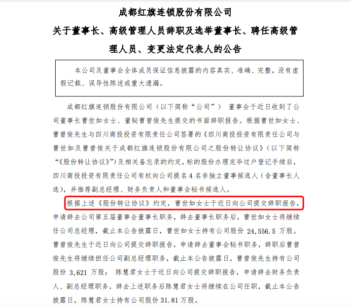 繼11月多名董事辭職后,紅旗連鎖再次迎來管理層的大變動。 01 紅旗連鎖高管“換血” 袁繼國接任董事長 12月3日,紅旗連鎖公布,公司董事會近日收到董事長曹世如、董秘曹曾俊、財務(wù)負(fù)責(zé)人陳慧君的辭職報告。經(jīng)過今日召開第五屆董事會第十九次會議,董事會選舉袁繼國任公司董事長。公司法定代表人相應(yīng)由曹世如變更為袁繼國。 與此同時,公司聘任袁繼國兼任董事會秘書(他同時擔(dān)任四川鄉(xiāng)村發(fā)展集團(tuán)有限公司董事長,未持有紅旗連鎖股份),李歡女士為財務(wù)負(fù)責(zé)人(曾任四川商投投資有限責(zé)任公司財務(wù)總監(jiān),同樣未持股),以及譚柳先生為副總經(jīng)理(曾任四川省食品有限責(zé)任公司董事長,也未持股)。他們的任期將延續(xù)至第五屆董事會任期結(jié)束。 值得注意的是,曹世如辭職后仍擔(dān)任公司總經(jīng)理職務(wù),持有公司24556.5萬股;原董秘曹曾俊辭職后擔(dān)任公司副總經(jīng)理,持有公司3621萬股;原財務(wù)負(fù)責(zé)人、副總經(jīng)理陳慧君辭職后將繼續(xù)在公司任職,持股31.81萬股;王寧、文春林、牛灝、熊健等高管辭去副總經(jīng)理職務(wù)后,將繼續(xù)在公司任職,分別持股35.29萬股、34.62萬股、33萬股、47.09萬股。 回顧11月,紅旗連鎖已有多名董事辭職。11月15日,紅旗連鎖宣布收到公司副董事長曹曾俊、董事張穎、董事譚磊、董事黃明月、獨立董事湯繼強(qiáng)、曹麒麟、廖中新提交的書面辭職報告。其中,曹曾俊同時辭去戰(zhàn)略委員會委員、薪酬與考核委員會委員職務(wù)。辭職后,他將繼續(xù)擔(dān)任公司副總經(jīng)理職務(wù)及董事會秘書。張穎、譚磊也分別辭去董事職務(wù),但仍將擔(dān)任公司副總經(jīng)理。而黃明月辭去董事職務(wù)后,將不再擔(dān)任公司任何職務(wù)。 此次管理層變動不僅涉及多位高管,還與紅旗連鎖的股權(quán)轉(zhuǎn)讓密切相關(guān)。根據(jù)曹世如、曹曾俊與四川商投投資有限責(zé)任公司簽署的《四川商投投資有限責(zé)任公司與曹世如及曹曾俊關(guān)于成都紅旗連鎖股份有限公司之股份轉(zhuǎn)讓協(xié)議》及相關(guān)備忘錄的約定,標(biāo)的股份辦理完畢過戶登記手續(xù)后,四川商投投資有限責(zé)任公司有權(quán)向公司提名4名非獨立董事候選人(含董事長人選)和3名獨立董事候選人。 鑒于《股份轉(zhuǎn)讓協(xié)議》項下標(biāo)的股份已辦理完畢過戶登記手續(xù),公司于近日接到四川商投投資有限責(zé)任公司通知,四川商投投資有限責(zé)任公司提名譚洪濤、賀立龍、周濤為公司第五屆董事會獨立董事候選人,提名袁繼國、黃東鎮(zhèn)、王庚、 李強(qiáng)為公司第五屆董事會非獨立董事候選人。 02 國資接手紅旗連鎖 控股權(quán)變更 1999年,曹世如創(chuàng)立紅旗連鎖品牌,開啟創(chuàng)業(yè)之路。2000年6月,成都紅旗連鎖有限公司成立;2012年,公司成為A股“便利連鎖超市第一股”,是西部地區(qū)最大的連鎖超市品牌。 上市后,公司經(jīng)歷了其快速增長期。2012-2019年,公司營收從39.05億元增長至78.23億元,年復(fù)合增長率為10.4%;凈利從1.73億元增長至5.16億元。但2019年之后,公司的凈利開始下滑,2020-2023年,公司凈利同比增幅分別為-2.2%、-4.66%、0.9%。這也促使了此次股權(quán)轉(zhuǎn)讓和管理層調(diào)整的發(fā)生。 2023年,四川國資向紅旗連鎖實控人收購了6.91%的股權(quán),并向第二大股東永輝超市收購了10%的股份。 經(jīng)過一系列審批程序,包括取得國家市場監(jiān)督管理總局的《經(jīng)營者集中反壟斷審查不予禁止決定書》和四川省國資委的相關(guān)批復(fù),股份轉(zhuǎn)讓事宜最終得以實施。 根據(jù)協(xié)議,曹世如和曹曾俊在股份轉(zhuǎn)讓完成后,將放棄其所持紅旗連鎖剩余281,775,000股股份(占紅旗連鎖總股本的20.72%)的表決權(quán)。此次權(quán)益變動后,紅旗連鎖有表決權(quán)股份總數(shù)為1,078,225,000股,商投投資控制的公司表決權(quán)比例達(dá)到21.32%,從而成為紅旗連鎖的新控股股東。公司實際控制人也隨之變更為四川省國資委。 財務(wù)數(shù)據(jù)顯示,紅旗連鎖前三季度實現(xiàn)營收77.67億元,同比增長1.65%;凈利潤3.90億元,同比下降4.21%。截至2024年6月30日,紅旗連鎖注冊會員人數(shù)超過500萬,門店數(shù)量達(dá)到3655家,上半年凈新開門店16家。 最后,此次管理層變動標(biāo)志著控股權(quán)的正式交接。在新的董事長及其管理層的帶領(lǐng)下,紅旗連鎖或?qū)⒂瓉硇碌陌l(fā)展篇章。我們將持續(xù)關(guān)注公司的動態(tài),期待其未來的表現(xiàn)。 |
