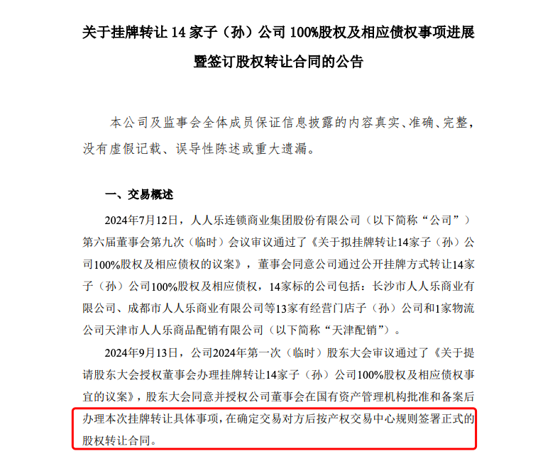12月3日,人人樂連鎖商業(yè)集團(tuán)股份有限公司發(fā)布公告,宣布通過公開掛牌方式轉(zhuǎn)讓14家子(孫)公司100%股權(quán)及相應(yīng)債權(quán)的進(jìn)展,并已簽訂股權(quán)轉(zhuǎn)讓合同。 此次股權(quán)轉(zhuǎn)讓涉及長沙市人人樂商業(yè)有限公司、成都市人人樂商業(yè)有限公司等13家有經(jīng)營門店的子(孫)公司,以及1家物流公司天津市人人樂商品配銷有限公司。其中,天津配銷100%股權(quán)于今年10月27日以人民幣2.39億元轉(zhuǎn)讓給天津優(yōu)達(dá)集團(tuán);而剩余的13家有經(jīng)營門店子(孫)公司100%股權(quán)于12月2日以人民幣13元轉(zhuǎn)讓給成都惠順多商貿(mào)有限公司。 據(jù)資料顯示,成都惠順多商貿(mào)有限公司注冊資本500萬元,成立于2024年10月9日,法定代表人為陳錦文,廣州惠順多百貨持股60%、廣東薈達(dá)物流有限公司持股40%。。 人人樂董事會全票通過了關(guān)于此次股權(quán)轉(zhuǎn)讓的議案。審計報告顯示,13家有經(jīng)營門店的標(biāo)的公司模擬總資產(chǎn)為10.22億元,模擬總負(fù)債為31.47億元,模擬凈資產(chǎn)為-21.25億元。 此次股權(quán)轉(zhuǎn)讓的目的是戰(zhàn)略調(diào)整,人人樂旨在通過收縮虧損區(qū)域戰(zhàn)線,集中資源發(fā)展優(yōu)勢區(qū)域,以降低經(jīng)營風(fēng)險,減少虧損,并改善財務(wù)狀況和經(jīng)營狀況。交易完成后,目標(biāo)公司所有的經(jīng)營管理、債權(quán)債務(wù)等將由各目標(biāo)公司按對應(yīng)的合同及規(guī)定處理。 |