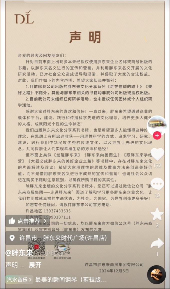 12月5日,胖東來發(fā)布聲明稱,目前市面上出現(xiàn)多本未經(jīng)授權(quán)使用胖東來企業(yè)名稱或商號出版的書籍,以胖東來名義進(jìn)行的宣傳和營銷,并利用胖東來名義開展的文化研究活動,已對社會公眾造成誤導(dǎo)和混淆,并侵犯了大家的合法權(quán)益。 對此,胖東來表示,希望大家知曉并甄別,目前除胖東來出版的胖東來文化分享系列《走在信仰的路上》《美好之路》書籍外,其他與胖東來相關(guān)的書籍均非胖東來出版或授權(quán)出版;目前胖東來未組織任何研學(xué)活動,也未授權(quán)任何團(tuán)體或個人組織研。 胖東來也感謝大家對其的喜歡和信任,并稱一直以來,胖東來希望通過商業(yè)的載體和平臺,建設(shè)、踐行和傳播科學(xué)先進(jìn)的文化理念,培養(yǎng)更多人健全的人格、成就陽光個性的生命狀態(tài)! 此外,胖東來表示,出版胖東來文化分享系列書籍,也是希望更多人能懂得這種好的理念,在思想上有所啟迪收獲-用理性科學(xué)的方式,追求學(xué)習(xí)、研究、建設(shè)、踐行我們中華民族優(yōu)秀的傳統(tǒng)文化、以及世界上先進(jìn)的文化理念,共同探索讓人們實(shí)現(xiàn)幸福生活的方法和途徑! 不過,市面上類似《覺醒胖東來》《胖東來向善而生》《跟胖東來學(xué)經(jīng)營》《大器必成胖東來的美好企業(yè)之路》等書籍中,存在對胖東來文化的片面解讀及誤讀!希望大家用理性的思維及做事方法來創(chuàng)造美好價(jià)值,而不是借用胖東來名義進(jìn)行不成熟的宣傳和營銷。 胖東來提醒,切記在購買書籍時注意甄別,以確保所購書籍的真實(shí)性。 |