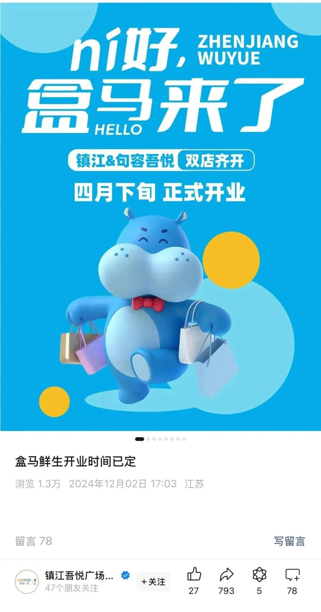 近日,盒馬鮮生在江蘇鎮(zhèn)江新開兩家門店,分別坐落于鎮(zhèn)江吾悅廣場與句容吾悅廣場。 據(jù)句容吾悅的工作人員透露,盒馬鮮生將入駐句容吾悅廣場地下一層,原鑫民匯超市撤場后,盒馬鮮生將進駐并開始裝修,預(yù)計明年四月底到五月初期間盛大開業(yè)。與此同時,鎮(zhèn)江吾悅廣場地下一層的永輝超市也將在12月15日撤場,為盒馬鮮生的入駐騰出空間。盒馬鮮生在該地點的裝修及開業(yè)時間同樣預(yù)計為明年四月底到五月初。 |