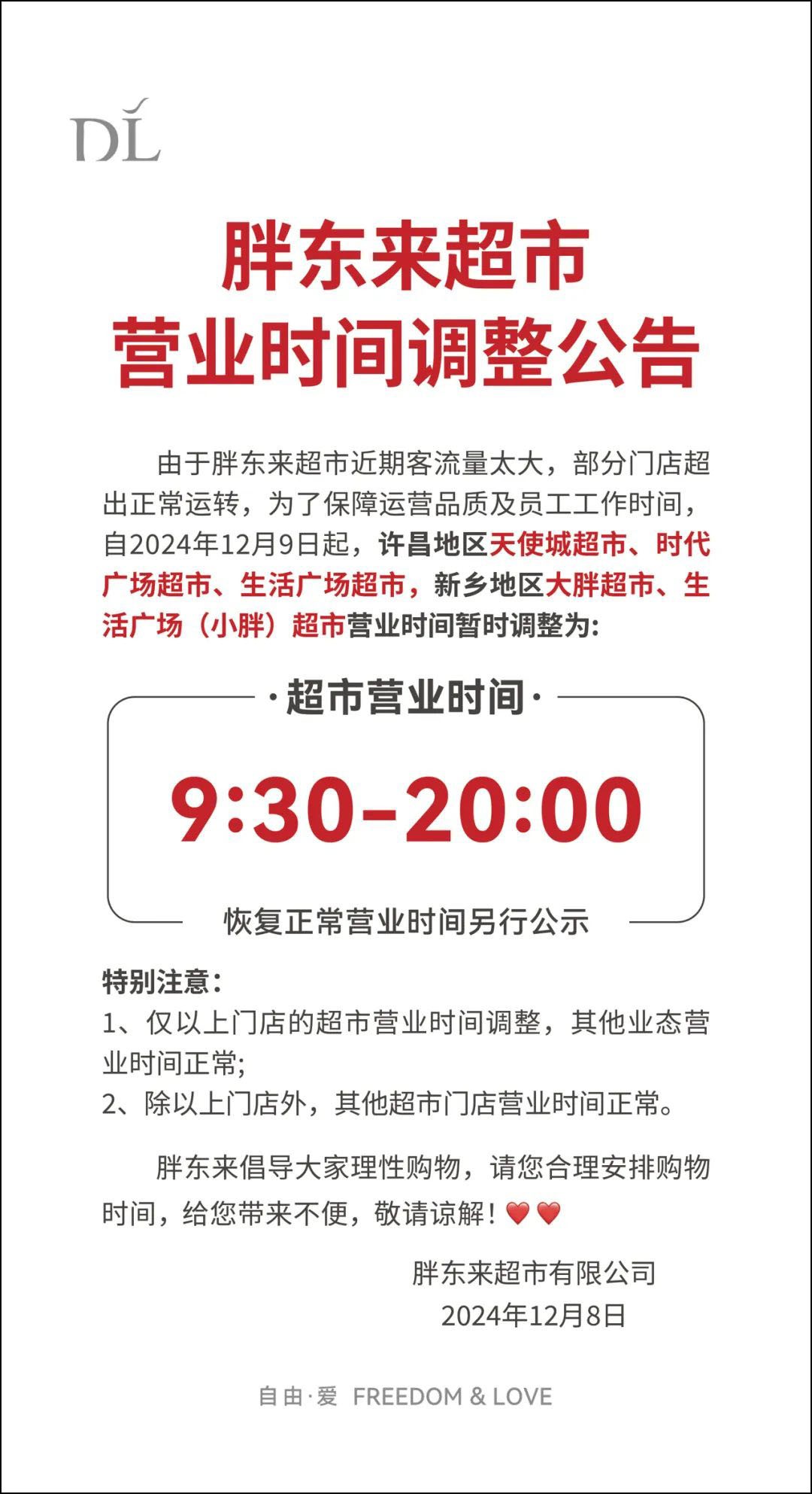 《職業(yè)零售網(wǎng)》獲悉,12月8日,胖東來發(fā)布超市營業(yè)時間調(diào)整公告。 公告中表示,由于胖東來超市近期客流量太大,部分門店超出正常運轉(zhuǎn),為了保障運營品質(zhì)及員工工作時間,自2024年12月9日起,許昌地區(qū)天使城超市、時代廣場超市、生活廣場超市,新鄉(xiāng)地區(qū)大胖超市、生活廣場(小胖)超市營業(yè)時間暫時調(diào)整為9:30-20:00,恢復正常營業(yè)時間另行公示。 值得注意的是,此次僅以上門店的超市營業(yè)時間調(diào)整,其他業(yè)態(tài)營業(yè)和門店營業(yè)時間正常。同時,胖東來倡導大家理性購物。 據(jù)了解,調(diào)整前胖東來超市的營業(yè)時間為:周日至周四:9:30-21:00;周五至周六:9:30-21:30。調(diào)整后,周日至周四營業(yè)時間縮短了一個小時,周五至周六營業(yè)時間縮短了一個半小時。 |