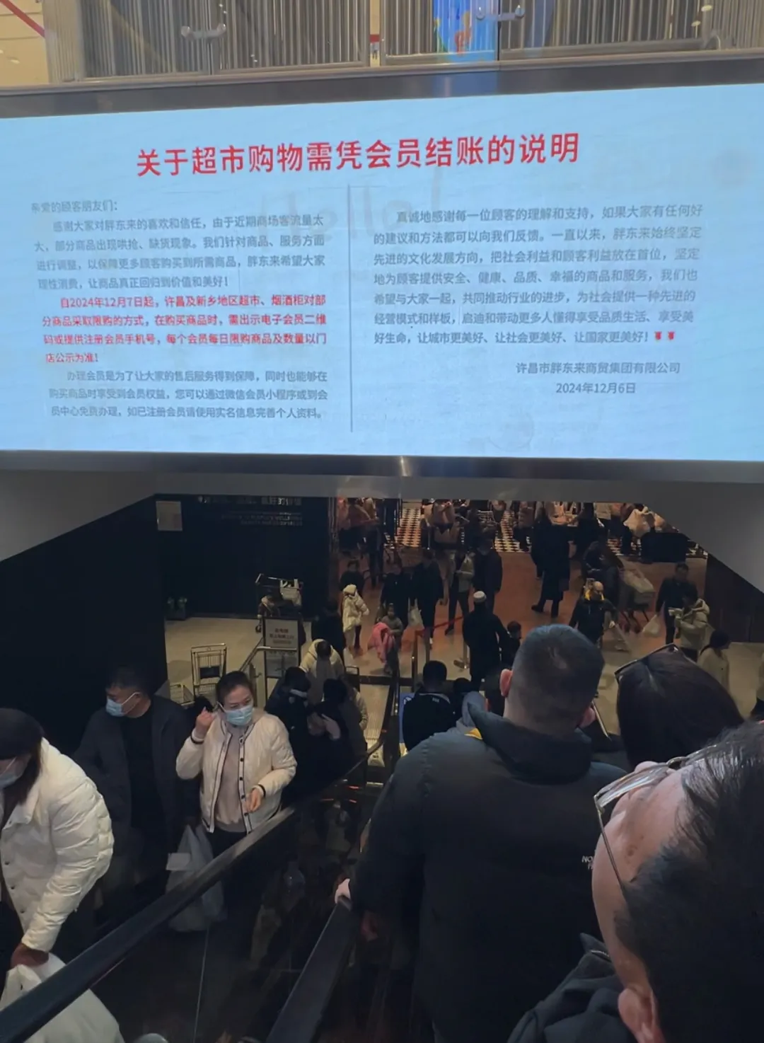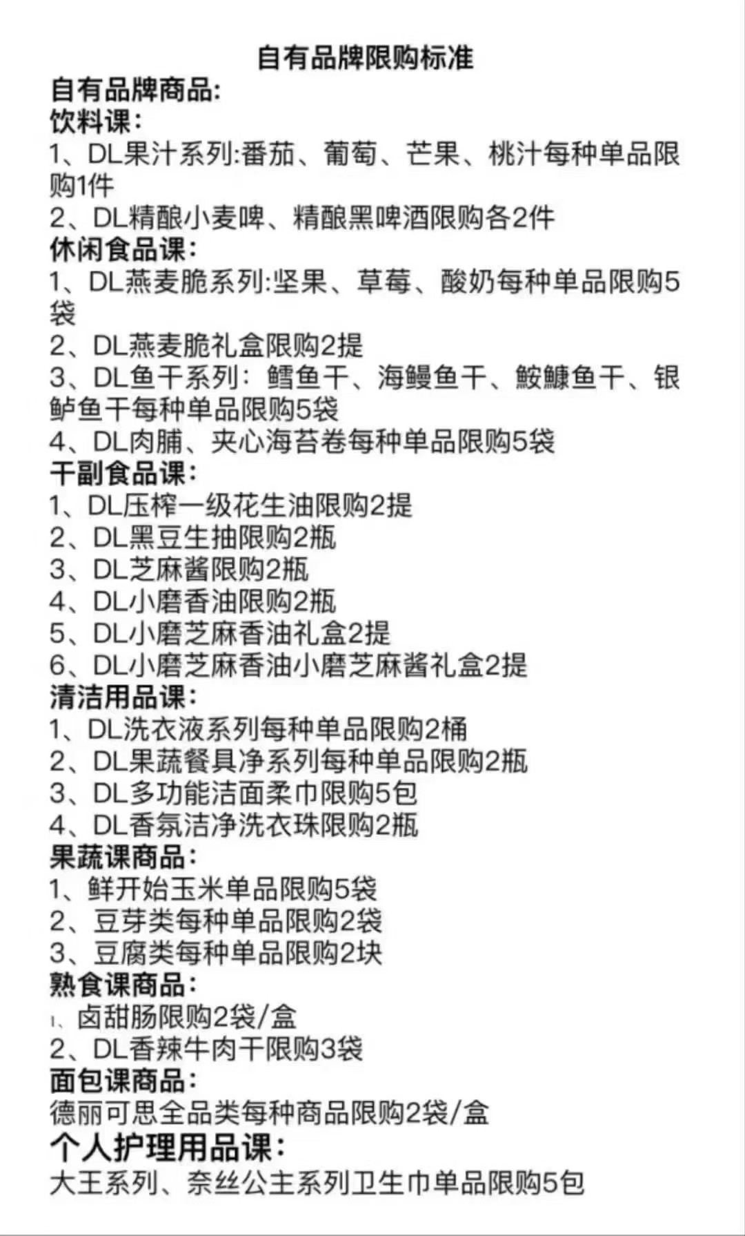 近日,胖東來各大超市人氣爆棚,胖東來自營(yíng)產(chǎn)品,成了代購(gòu)爭(zhēng)搶的熱門商品,從網(wǎng)紅牛肉干、大月餅到啤酒、茶葉等,熱門商品上架即被搬空,部分商品出現(xiàn)被哄搶、缺貨的情形。 面對(duì)這一現(xiàn)象,胖東來創(chuàng)始人于東來在社交平臺(tái)上及時(shí)發(fā)聲,表示將盡快解決過度代購(gòu)的問題。隨后,在12月6日深夜,胖東來官方賬號(hào)也發(fā)布了《關(guān)于超市購(gòu)物需憑會(huì)員結(jié)賬的說明》,進(jìn)一步規(guī)范了購(gòu)物流程。 那么,第一次到胖東來購(gòu)物,不知道胖東來自營(yíng)商品有哪些,每人限購(gòu)多少?超市員工耐心地一一解答,并出示了DL自有品牌限購(gòu)標(biāo)準(zhǔn)。 胖東來超市限購(gòu)明細(xì) 一、 飲料類:1.DL果汁系列:番茄汁、葡萄汁、芒果汁、桃汁每種單品限購(gòu)1件。 2.DL精釀小麥啤、精釀黑啤各限購(gòu)2件。 二、 休閑食品:1.DL燕麥脆系列:堅(jiān)果味、草莓味、酸奶味每種單品限購(gòu)5袋。 2.DL燕麥脆禮盒限購(gòu)2提。 3.DL魚干系列:鱈魚干、海鰻干等每種限購(gòu)5袋。 4.DL肉脯、夾心海苔卷每種限購(gòu)5袋。 三、 干副食類:1.DL壓榨一級(jí)花生油限購(gòu)2提。 2.DL黑豆生抽限購(gòu)2瓶。 3.DL芝麻醬限購(gòu)2瓶。 4.DL小磨芝麻香油限購(gòu)2瓶。 5.DL小磨芝麻香油禮盒限購(gòu)2提。 四、 清潔用品:1.DL洗衣液系列每種單品限購(gòu)2桶。 2.DL果蔬凈系列每種單品限購(gòu)2瓶。 3.DL多功能潔面巾限購(gòu)5包。 4.DL香氛潔凈洗衣凝珠限購(gòu)2盒。 五、 果蔬類商品:1.鮮開始玉米單品限購(gòu)5袋。 2.DL豆芽類每種單品限購(gòu)2袋。 3.DL豆腐類每種單品限購(gòu)2袋。 六 熟食類商品:1.鹵甜腸限購(gòu)2盒(袋)。 2.DL香辣牛肉干限購(gòu)3袋。 七、 烘焙類商品:德麗可思全品類商品限購(gòu)2盒(袋)。 八、 衛(wèi)生用品類: 大王系列、奈絲公主系列衛(wèi)生巾單品限購(gòu)5包。 |