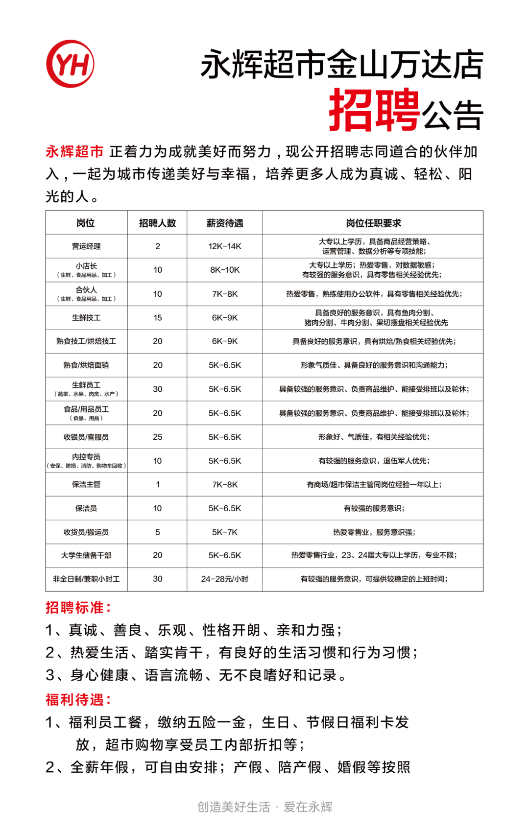 12月10日消息,首家學(xué)習(xí)胖東來(lái)自主調(diào)改店——上海金山萬(wàn)達(dá)店已正式開(kāi)啟招聘。 此次招聘涵蓋了營(yíng)運(yùn)經(jīng)理、生鮮/加工/食品用品小店長(zhǎng)、生鮮技工、生鮮/加工/食品用品合伙人、蔬菜/水果/肉禽/水產(chǎn)生鮮員工、食品/用品員工等多個(gè)崗位,共計(jì)招聘人數(shù)約228人。薪資方面,最低起薪為5000元/月,最高可達(dá)14000元/月,具體薪資水平將根據(jù)崗位的不同而有所差異。 |