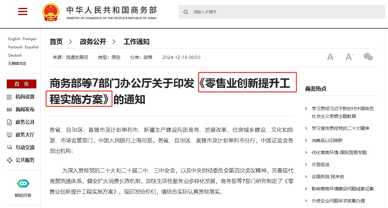 為深入貫徹黨的二十大和二十屆二中、三中全會,以及中央經(jīng)濟(jì)工作會議精神,完善現(xiàn)代商貿(mào)流通體系,健全擴(kuò)大消費(fèi)長效機(jī)制,加快生活性服務(wù)業(yè)多樣化發(fā)展,近日,商務(wù)部等7部門聯(lián)合印發(fā)了《零售業(yè)創(chuàng)新提升工程實(shí)施方案》(以下簡稱《方案》)。 《方案》提出培育現(xiàn)代零售體系的目標(biāo)。以習(xí)近平新時代中國特色社會主義思想為指導(dǎo),完整、準(zhǔn)確、全面貫徹新發(fā)展理念,按照“全面部署、試點(diǎn)探索”思路,以城市試點(diǎn)為抓手,聚焦百貨店、購物中心、超市、社區(qū)商業(yè)中心等零售商業(yè)設(shè)施改造提升,通過健全工作機(jī)制、創(chuàng)新工作方式、強(qiáng)化支持政策,力爭到2029年,初步形成供給豐富、布局均衡、渠道多元、服務(wù)優(yōu)質(zhì)、智慧便捷、綠色低碳的現(xiàn)代零售體系。 《方案》部署五個方面的工作任務(wù)。推動場景化改造,鼓勵融合性商業(yè),創(chuàng)新時尚型商業(yè),倡導(dǎo)策展型商業(yè),培育主題式商業(yè),完善社區(qū)型商業(yè)。推動品質(zhì)化供給,以消費(fèi)者為中心,誠信經(jīng)營、品質(zhì)當(dāng)先、服務(wù)至上,優(yōu)化商品和服務(wù)體驗(yàn)。推動數(shù)字化賦能,推動實(shí)體零售與數(shù)字經(jīng)濟(jì)深度融合,形成新質(zhì)生產(chǎn)力,提升效率,讓消費(fèi)更便捷。推動多元化創(chuàng)新,鼓勵業(yè)態(tài)融合,“大而強(qiáng)”“小而美”“專而精”與“一店多能”模式百花齊放。推動供應(yīng)鏈提升,鼓勵強(qiáng)化協(xié)同,優(yōu)化流通渠道,高效銜接供銷,促進(jìn)降本增效。 《方案》明確工作路徑和保障政策。明確了開展摸底調(diào)查、編制試點(diǎn)方案、推動項(xiàng)目啟動、調(diào)動各方力量、“一店一策”改造的工作路徑。提出了加大金融支持、優(yōu)化經(jīng)營環(huán)境、搭建交流平臺、夯實(shí)發(fā)展基礎(chǔ)等保障措施。將零售業(yè)創(chuàng)新提升與一刻鐘便民生活圈、推進(jìn)完整社區(qū)建設(shè)、發(fā)展基礎(chǔ)設(shè)施領(lǐng)域不動產(chǎn)投資信托基金(REITs)、營造線上線下公平競爭環(huán)境等相銜接,加強(qiáng)政策集成,與盤活存量資產(chǎn)、推動商旅文融合、發(fā)展首發(fā)經(jīng)濟(jì)、推廣國貨“潮品”等相結(jié)合,形成工作合力。 下一步,商務(wù)部等7部門將深入實(shí)施零售業(yè)創(chuàng)新提升工程,通過每年確定一批零售業(yè)創(chuàng)新提升試點(diǎn)城市,完成一批存量零售商業(yè)設(shè)施改造,推廣一批經(jīng)驗(yàn)成熟的典型案例,引導(dǎo)和推動零售業(yè)高質(zhì)量發(fā)展,更好發(fā)揮零售業(yè)在引導(dǎo)生產(chǎn)、擴(kuò)大消費(fèi)、吸納就業(yè)、保障民生等方面的重要作用,為建設(shè)現(xiàn)代商貿(mào)流通體系、暢通經(jīng)濟(jì)循環(huán)提供必要支撐。 |