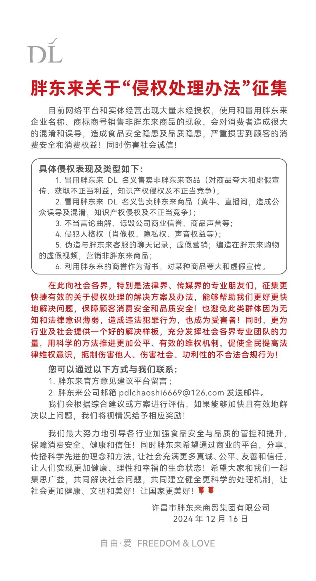 12月16日晚間,胖東來官方賬號發(fā)文,公開征集胖東來關(guān)于“侵權(quán)處理辦法”: 目前網(wǎng)絡(luò)平臺和實(shí)體經(jīng)營出現(xiàn)大量未經(jīng)授權(quán),使用和冒用胖東來企業(yè)名稱、商標(biāo)商號銷售非胖東來商品的現(xiàn)象,會(huì)對消費(fèi)者造成很大的混淆和誤導(dǎo),造成食品安全隱患及品質(zhì)隱患,嚴(yán)重?fù)p害到顧客的消費(fèi)安全和消費(fèi)權(quán)益!同時(shí)傷害社會(huì)誠信! 具體侵權(quán)表現(xiàn)及類型如下: 1.冒用胖東來 DL 名義售賣非胖東來商品(對商品夸大和虛假宣傳、獲取不正當(dāng)利益,知識產(chǎn)權(quán)侵權(quán)及不正當(dāng)競爭); 2.冒用胖東來 DL 名義售賣胖東來商品(黃牛、直播間,造成公眾誤導(dǎo)及混淆,知識產(chǎn)權(quán)侵權(quán)及不正當(dāng)競爭); 3.不當(dāng)言論曲解、詆毀公司商業(yè)信譽(yù)、商品聲譽(yù)等; 4.侵犯人格權(quán)(肖像權(quán)、隱私權(quán)、聲音權(quán)益等); 5.偽造與胖東來客服的聊天記錄,虛假營銷;編造在胖東來購物的虛假視頻,營銷非胖東來商品; 6.利用胖東來的商譽(yù)作為背書,對某種商品夸大和虛假宣傳。 胖東來方面表示,在此向社會(huì)各界,特別是法律界、傳媒界的專業(yè)朋友們,征集更快捷有效的關(guān)于侵權(quán)處理的解決方案及辦法,能夠幫助我們更好更快地解決問題,保障顧客消費(fèi)安全和品質(zhì)安全! |