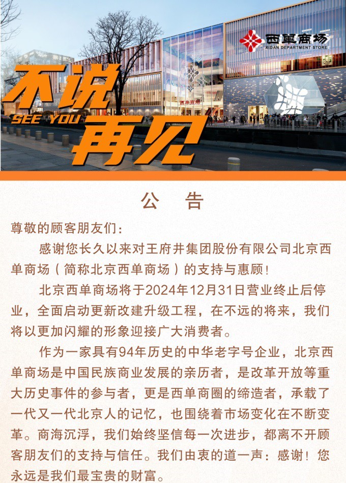 12月16日,北京西單商場(chǎng)發(fā)布停業(yè)改建公告。 根據(jù)公告,北京西單商場(chǎng)將于2024年12月31日營(yíng)業(yè)終止后停業(yè),全面啟動(dòng)更新改建升級(jí)工程。 公開(kāi)資料顯示:北京西單商場(chǎng)始建于1930年,截至目前已經(jīng)擁有94年歷史。上世紀(jì)80年代重新落成時(shí),它是北京最具標(biāo)志性的百貨商場(chǎng)之一,與東安市場(chǎng)、東四人民市場(chǎng)(現(xiàn)隆福大廈)、北京市百貨大樓并稱為“北京市四大百貨”。 商場(chǎng)現(xiàn)有的主體建筑于1978年正式對(duì)外營(yíng)業(yè),隨后于1995年和2003年經(jīng)歷了兩次重要的擴(kuò)建和改造。 1986-1993年,西單商場(chǎng)連續(xù)八年奪得北京市大型百貨店年銷售額第一,并成為北京首家年銷售額突破10億元的單體店。 10月30日,王府井集團(tuán)股份有限公司發(fā)布關(guān)于固定資產(chǎn)處置的公告。其中提到,為推進(jìn)公司西單商場(chǎng)優(yōu)化改造項(xiàng)目實(shí)施,提升西單商場(chǎng)在西單商圈的競(jìng)爭(zhēng)力,公司計(jì)劃對(duì)西單商場(chǎng)進(jìn)行改造提升。 根據(jù)《聯(lián)商網(wǎng)》次年報(bào)道,西單商場(chǎng)已完成改造升級(jí)設(shè)計(jì)方案,未來(lái)整體建筑面積65000㎡,其中規(guī)劃兩層作為停車設(shè)施,其余面積將作為經(jīng)營(yíng)使用。商場(chǎng)的整體商戶數(shù)量將控制在200個(gè)以內(nèi),實(shí)現(xiàn)減量提質(zhì),打造集約、高品質(zhì)商業(yè)業(yè)態(tài)。商場(chǎng)地下一層將設(shè)置“西單記憶1930”文化街區(qū),引入文藝演出、電影等文化體驗(yàn)業(yè)態(tài)。 商場(chǎng)負(fù)責(zé)人表示,改造期間商場(chǎng)將轉(zhuǎn)向線上經(jīng)營(yíng),確保顧客的需求得到滿足。同時(shí),商場(chǎng)也將繼續(xù)與社會(huì)各界保持溝通,收集市民的意見(jiàn)和建議,不斷完善改造方案。 |