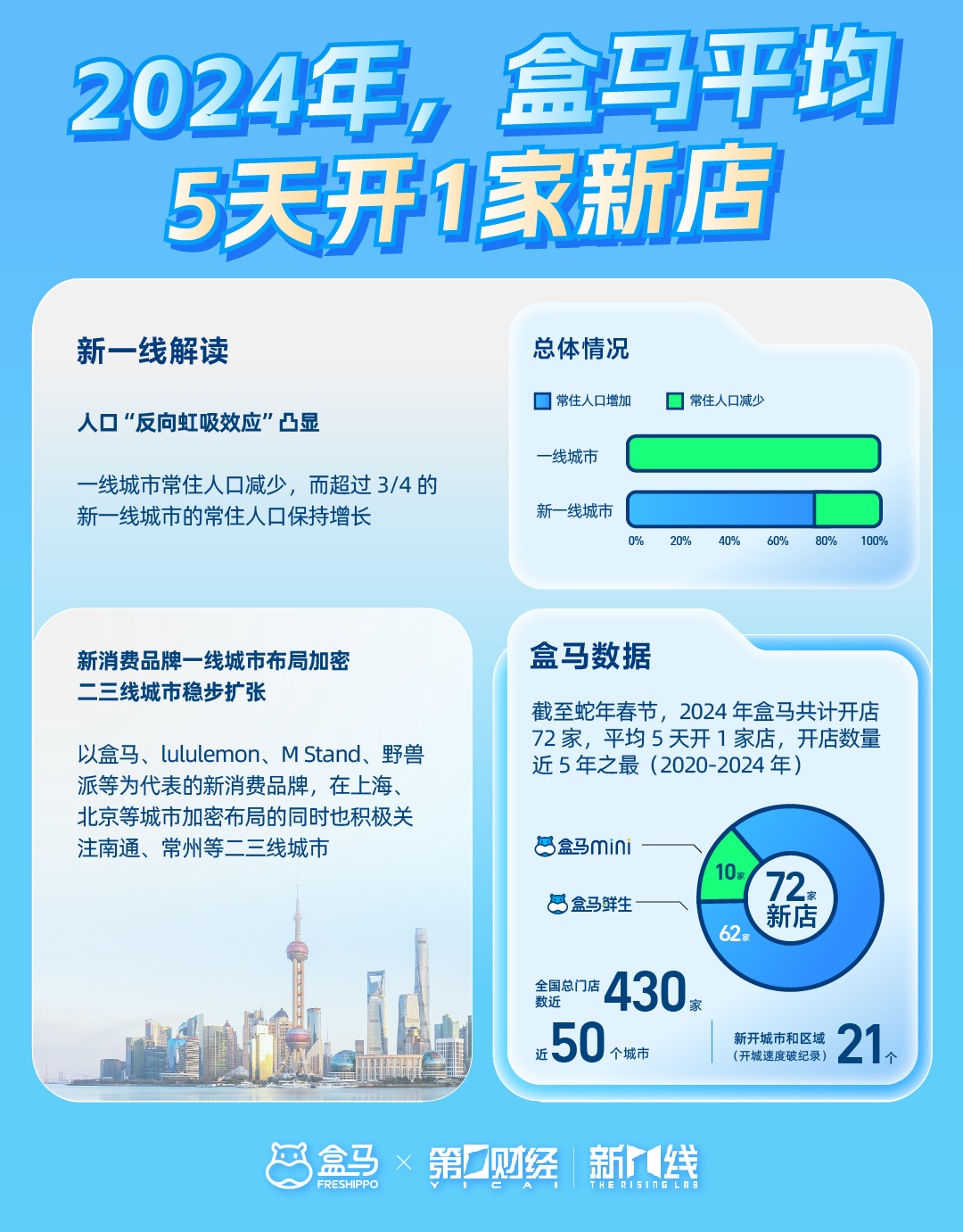 近日,盒馬和第一財(cái)經(jīng)·新一線(xiàn)城市研究所聯(lián)合發(fā)布的《2024盒區(qū)房消費(fèi)趨勢(shì)洞察報(bào)告》(下簡(jiǎn)稱(chēng)《報(bào)告》)顯示,蛇年春節(jié)前,盒馬預(yù)計(jì)今年開(kāi)出72家鮮生門(mén)店,全國(guó)門(mén)店總數(shù)接近430家,以平均5天開(kāi)出一家新店的速度,成為五年來(lái)最快。 圖1:《報(bào)告》顯示,盒馬2024年平均五天開(kāi)一家新店 新一線(xiàn)城市研究所在《報(bào)告》中分析稱(chēng),2024年“反向虹吸效應(yīng)”明顯。相比一線(xiàn)大城市,越來(lái)越多的年輕人傾向于去往新一線(xiàn)城市和二三線(xiàn)城市發(fā)展。以盒馬、lululemon、M Stand、野獸派等為代表的消費(fèi)品牌,除了繼續(xù)在上海、北京等城市加密布局外,也開(kāi)始積極關(guān)注南通、常州等二三線(xiàn)城市的機(jī)會(huì)。 過(guò)去一年,盒馬在北上廣深持續(xù)開(kāi)店,同時(shí)也在快速進(jìn)入新城。報(bào)告顯示,盒馬今年進(jìn)入了21個(gè)城市和區(qū)域,從珠三角腹地到江浙滬的縣級(jí)市,再到山東北部城市和陜西關(guān)中地區(qū),深入全國(guó)各地。值得一提的是,新開(kāi)到中山、珠海、東莞的盒馬鮮生,將承接更多港客“北上”的消費(fèi)熱潮。其中,盒馬的珠海首店,距離澳門(mén)拱北海關(guān)僅9公里。 圖2:2024年3月,長(zhǎng)沙縣盒馬鮮生萬(wàn)象匯店開(kāi)業(yè)現(xiàn)場(chǎng) 在盒馬新進(jìn)入的許多潛力型城市,當(dāng)?shù)叵M(fèi)表現(xiàn)都頗為亮眼!秷(bào)告》中顯示,東營(yíng)西城萬(wàn)達(dá)廣場(chǎng)店的烘焙檔口,一天內(nèi)賣(mài)出了價(jià)值40萬(wàn)的烘焙;珠海開(kāi)業(yè)當(dāng)天,出現(xiàn)了帝王蟹在購(gòu)物籃里排隊(duì)等結(jié)賬的景象……盒馬成為多地“首店經(jīng)濟(jì)”的典型代表,引燃了城市消費(fèi)活力。 |