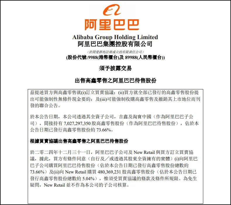 歷時近3個月,大潤發(fā)母公司高鑫零售的收購案終于塵埃落定。 01 131.38億港元 阿里清倉大潤發(fā)母公司 1月1日,阿里巴巴集團發(fā)布公告,宣布子公司及New Retail與德弘資本訂立協(xié)議,出售所持高鑫零售全部股權,合計占高鑫零售已發(fā)行股份總數(shù)約78.7%。 根據(jù)協(xié)議,阿里巴巴子公司及New Retail將有權就待售股份收取最高金額約131.38億港元(約合123億元人民幣),相當于1.75港元/股。其中,阿里巴巴集團出售高鑫零售73.66%股份,所得款項總額約122.98億港元。 此次出售完成后,阿里巴巴集團將不再持有高鑫零售的任何股權。公告顯示,阿里巴巴將持續(xù)聚焦核心業(yè)務,提升股東回報。 值得一提的是,高鑫零售CEO沈輝在公告發(fā)出后,也向大潤發(fā)全體員工發(fā)布了一封信,詳細闡述了交易的結果、由來及未來展望。 此次收購方德弘資本是一家國際性私募股權投資機構,成立于1995年,總部位于香港,由前KKR全球合伙人劉海峰和華裕能創(chuàng)建,管理團隊自1993年開始在大中華區(qū)進行投資,在過去的26年中,該團隊領導了一系列在中國PE界具有開創(chuàng)性的投資項目,扶植了眾多行業(yè)領軍企業(yè)。 在創(chuàng)立德弘資本之前,劉海峰先生曾任KKR全球合伙人、KKR亞洲私募股權投資聯(lián)席主管兼大中華區(qū)首席執(zhí)行官;華裕能先生曾任KKR全球合伙人,負責大中華區(qū)的投資業(yè)務。在加入KKR之前,劉海峰先生與華裕能先生曾領導了摩根士丹利在亞洲及大中華區(qū)的私募股權投資業(yè)務。 他們領導投資了眾多行業(yè)知名企業(yè),并在這些企業(yè)的董事會任職,例如平安保險、蒙牛乳業(yè)、青島海爾、圣農發(fā)展、遠東宏信、中金公司、百麗國際、現(xiàn)代牧業(yè)、中國臍帶血庫、中糧肉食、南孚電池、恒安集團、聯(lián)合環(huán)境、永樂家電、亞洲牧業(yè)、啟明醫(yī)療、MFS等。 02 牽手八年后 阿里與大潤發(fā)分手 回顧阿里與高鑫零售的交織關系,時間長達8年。 2017年,阿里巴巴首次入股高鑫零售,宣布投入224億港元,直接和間接持有高鑫零售36.16%的股份。 2020年,阿里再次增資,直接和間接持有72%的股權,全面控制高鑫零售。 被收購的高鑫零售成為阿里的“新零售試驗田”。阿里特意從內部挑選出有快消工作經(jīng)驗的林小海,接棒黃明端成為高鑫零售CEO。任職期間,林小海提出“多業(yè)態(tài)全渠道”戰(zhàn)略,通過數(shù)字化和組織創(chuàng)新,完成生鮮自營化的供應鏈能力建設。截至目前,高鑫零售旗下?lián)碛写鬂櫚l(fā)、大潤發(fā)Super、M會員店三個主力業(yè)態(tài)品牌。 但值得注意的是,高鑫零售從2018財年至2023財年,無論是總銷售營收、收入還是經(jīng)營利潤,都呈現(xiàn)出下滑趨勢。營收規(guī)模由2018財年的1013.15億元縮水到2024財年的725.67億元;歸屬母公司凈利則分別為25.88億元、28.34億元、28.72億元、-8.26億元、-7.39億元、1.09億元、-16.68億元,可以看出,2020財年盈利最高、2024財年虧損最大。 虧損之下,大潤發(fā)多次傳出被出售的消息。2024年3月,有消息稱“阿里將大潤發(fā)賣給中糧”。后大潤發(fā)雖否認,但決心聚焦主業(yè)的阿里明確“要逐步退出非核心的實體零售”。 2024年10月15日,高鑫零售發(fā)布公告表示,董事會于2024年9月27日接獲一名有意要約人的接觸函,表明有意就公司全部已發(fā)行股份提出附先決條件的自愿有條件要約。 最終,在2025年1月1日晚,阿里巴巴將其持有的高鑫零售全部股權轉讓給了德弘資本。 在傳出交易之前,高鑫零售并未放棄自救。2024年3月底,林小海辭去了CEO一職,由老將沈輝接任高鑫零售執(zhí)行董事兼CEO,黃明端則繼續(xù)擔任董事長。新的管理團隊上任后,迅速進行了人事和業(yè)務上的調整。盡管部分門店關閉,但高鑫零售仍在積極拓展新店,并調整其經(jīng)營策略。尤其是近幾年,公司不斷加大對“中潤發(fā)”(大潤發(fā)Super)及“M會員店”的投入力度,以期實現(xiàn)業(yè)績的逆襲。 財報數(shù)據(jù)顯示,2024財年內,高鑫零售新開了多家門店,已覆蓋全國多個省市自治區(qū)和城市。同時,公司還預計投入12億元進行業(yè)務投拓,包括大中型超市的開店和會員店的拓展以及門店設備的更新投資。未來,高鑫零售將繼續(xù)在全國范圍內進行布局,不再局限于華東地區(qū);而會員店則主要聚焦在華東的二、三線城市發(fā)展。 此外,大潤發(fā)還積極拓展線上業(yè)務,利用自有APP大潤發(fā)優(yōu)鮮等平臺為消費者提供更加便捷的購物體驗。財報顯示,報告期內自有APP大潤發(fā)優(yōu)鮮占線上B2C營收的比例相當可觀,線上B2C總體訂單量也實現(xiàn)了同比增長。 最新發(fā)布的財年中期業(yè)績顯示,高鑫零售半年營收達到347.08億元,凈利潤1.86億元,成功實現(xiàn)了扭虧為盈。截至2024年9月30日,高鑫零售集團員工人數(shù)也達到了85778人。 最后, 近年來,阿里巴巴集團明確提出了“用戶為先、AI驅動”兩大戰(zhàn)略重心,并圍繞這兩大重心積極進行業(yè)務梳理,重塑業(yè)務的戰(zhàn)略優(yōu)先級。這一戰(zhàn)略調整,無疑為阿里巴巴未來的發(fā)展指明了方向。 在此背景下,阿里巴巴開始有序退出非核心資產(chǎn),戰(zhàn)略聚焦核心業(yè)務的發(fā)展信號愈發(fā)清晰。去年12月,阿里巴巴減持小鵬汽車股份,套現(xiàn)近4億美元,隨后多次