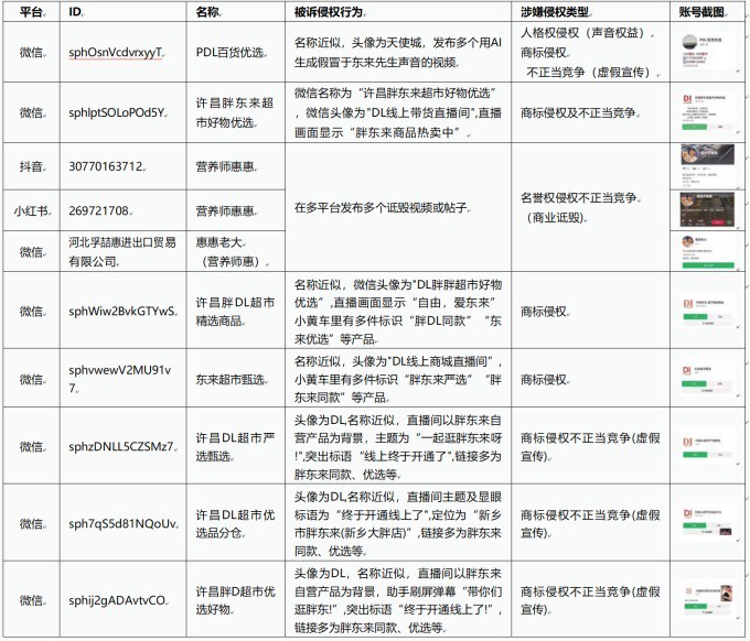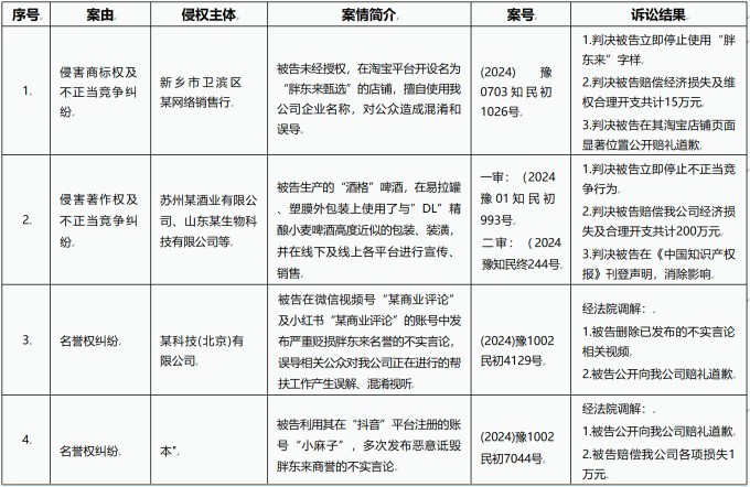 1月3日晚間,胖東來通過胖東來商貿(mào)集團公眾號,發(fā)布了《胖東來關(guān)于侵權(quán)行為的處理公示》,闡述了侵權(quán)行為的危害,并表示對于侵權(quán)行為會堅決予以抵制。一經(jīng)發(fā)現(xiàn),將會在第一時間進行取證,并通過法律途徑追究其侵權(quán)責(zé)任!同時也希望通過對侵權(quán)行為處理的公示,讓大家知曉并注意甄別。 包括部分已訴訟侵權(quán)案件的結(jié)果以及已取證擬起訴的侵權(quán)賬號進行了特別公示,具體內(nèi)容如下: 胖東來關(guān)于侵權(quán)行為的處理公示 目前網(wǎng)絡(luò)和實體經(jīng)營中出現(xiàn)大量利用胖東來名義的各種侵權(quán)行為,此類侵權(quán)是不尊重他人權(quán)益、違反社會秩序、法律秩序的表現(xiàn),也會破壞公平競爭的市場環(huán)境、嚴(yán)重損害到顧客的消費安全和消費權(quán)益!導(dǎo)致社會資源的浪費,傷害社會誠信!這種因無知和法律意識淡薄,實施的侵權(quán)甚至是犯罪行為,不僅傷害他人、傷害社會、也傷害了自己! 對于侵權(quán)行為我們堅決予以抵制,一經(jīng)發(fā)現(xiàn),我們會在第一時間進行取證,并通過法律途徑追究其侵權(quán)責(zé)任!希望通過對侵權(quán)行為處理的公示,讓大家知曉并注意甄別,啟發(fā)和引導(dǎo)大家重視并了解侵權(quán)的危害,主動維護和尊重他人的知識產(chǎn)權(quán)及其他合法權(quán)益,共同監(jiān)督、創(chuàng)造和維護真誠、公平、正義、文明、和諧的社會環(huán)境,保障和維護企業(yè)、消費者的合法權(quán)益,更好地推動法治建設(shè)的進步! 一、已訴訟侵權(quán)案件的結(jié)果(部分) 二、已取證擬起訴的侵權(quán)賬號 (具體見官網(wǎng):胖東來關(guān)于侵權(quán)行為處理公示) 胖東來始終堅定圍繞文化發(fā)展方向,為行業(yè)、社會提供真誠、公平、健康的經(jīng)營管理模式和運營體系樣板,加強文明建設(shè)、踐行和落實,與大家一起推動社會文明的進步和發(fā)展,實現(xiàn)更多人輕松、美好的生命狀態(tài),共同為社會創(chuàng)造更多信任、友善的人文環(huán)境,讓人們更幸福、讓社會更文明、讓國家更美好! 許昌市胖東來商貿(mào)集團有限公司 2025年1月3日 |