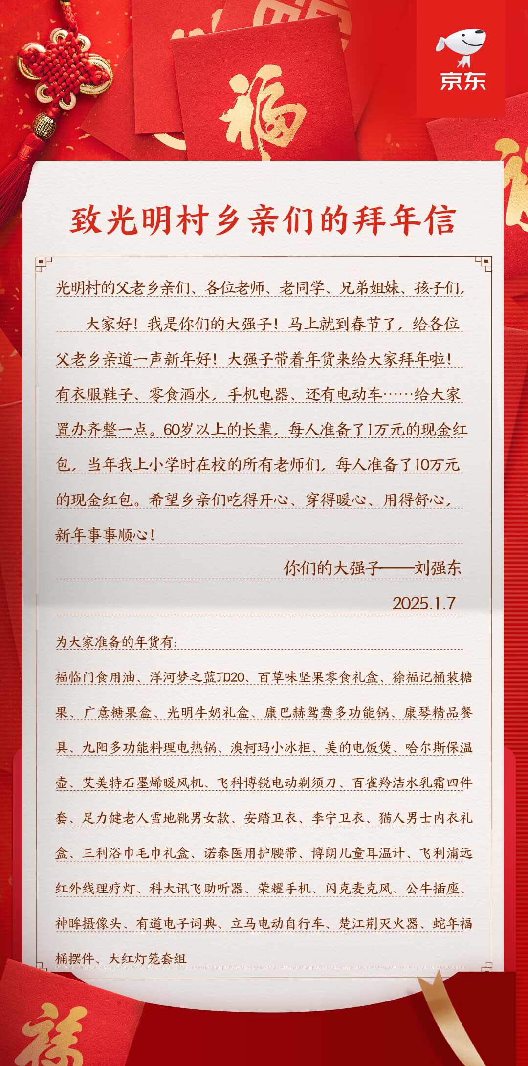 1月7日消息,據(jù)梨視頻今日?qǐng)?bào)道,劉強(qiáng)東在一封寫給老家鄉(xiāng)親的拜年信中承諾:為自己在光明村讀小學(xué)時(shí)所有在校老師每人準(zhǔn)備了10萬(wàn)元的現(xiàn)金紅包。 據(jù)悉,劉強(qiáng)東今年仍會(huì)給家鄉(xiāng)人民發(fā)放現(xiàn)金和年貨,除老年手機(jī)、電動(dòng)車、助聽器等助老年貨,村中60歲以上的老人依舊能收到每人1萬(wàn)元的現(xiàn)金紅包。 京東集團(tuán)創(chuàng)始人、董事會(huì)主席劉強(qiáng)東是江蘇宿遷人。劉強(qiáng)東曾稱當(dāng)年全村湊錢送他上學(xué),帶著500塊錢和76個(gè)雞蛋去了中國(guó)人民大學(xué),“村民扶我青云志,我送村民萬(wàn)兩金。” 此外,京東集團(tuán)已在宿遷建設(shè)了京東全國(guó)客服中心、淮海經(jīng)濟(jì)區(qū)倉(cāng)儲(chǔ)物流中心、京東智慧城和京東物流平行總部等項(xiàng)目。2023年6月16日,京東集團(tuán)全國(guó)首個(gè)線下互聯(lián)網(wǎng)醫(yī)院——宿豫醫(yī)院正式開業(yè)。 IT之家查詢京東集團(tuán)財(cái)報(bào)獲悉,京東2024年第三季度收入2604億元人民幣,同比增長(zhǎng)5.1%;該季度歸屬于公司普通股股東的凈利潤(rùn)為人民幣117億元,同比增長(zhǎng)47.8%。 |