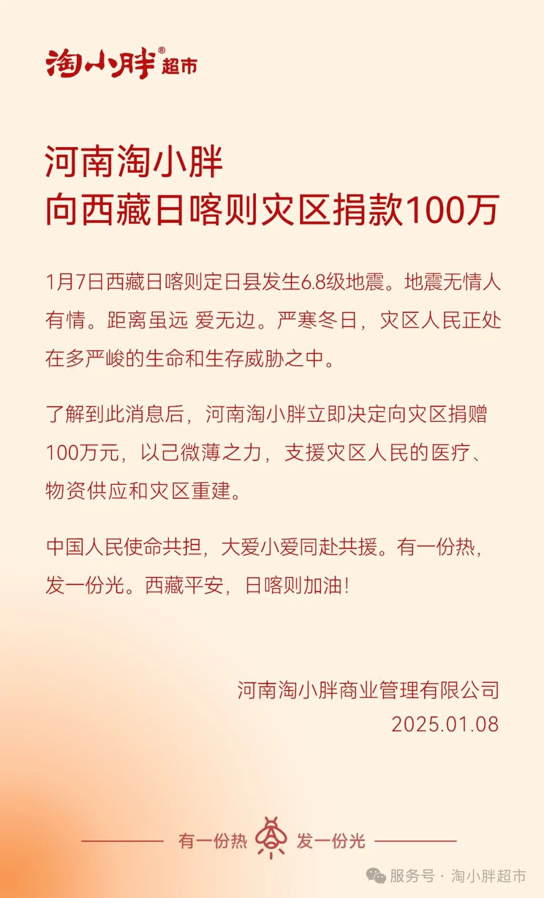 1月7日西藏日喀則定日縣發(fā)生6.8級(jí)地震。地震無(wú)情人有情。距離雖遠(yuǎn) 愛(ài)無(wú)邊。嚴(yán)寒冬日,災(zāi)區(qū)人民正處在多嚴(yán)峻的生命和生存威脅之中。 了解到此消息后,河南淘小胖立即決定向?yàn)?zāi)區(qū)捐贈(zèng)100萬(wàn)元,以已微薄之力,支援災(zāi)區(qū)人民的醫(yī)療物資供應(yīng)和災(zāi)區(qū)重建,中國(guó)人民使命共擔(dān),大愛(ài)小愛(ài)同赴共援。有一份熱,發(fā)一份光。西藏平安,日喀則加油! |