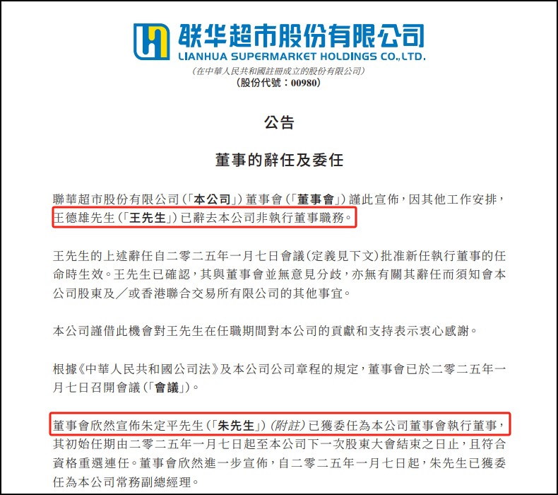 1月7日,聯(lián)華超市股份有限公司(簡稱“聯(lián)華超市”)發(fā)布董事變動公告,宣布王德雄先生因其他工作安排辭去公司非執(zhí)行董事職務(wù),同時任命朱定平先生為新的執(zhí)行董事及常務(wù)副總經(jīng)理。 聯(lián)華超市在公告中指出,因其他工作安排,王德雄先生已辭去公司非執(zhí)行董事職務(wù),該辭任自2025年1月7日會議批準新任執(zhí)行董事的任命時生效。王德雄先生確認與董事會無意見分歧,且無須通知股東其他事項。 與此同時,聯(lián)華超市董事會宣布,朱定平先生已被委任為公司執(zhí)行董事,任期自2025年1月7日起至下一次股東大會結(jié)束之日止,且符合資格重選連任。此外,朱定平先生還被任命為公司常務(wù)副總經(jīng)理,自2025年1月7日起生效。 朱定平先生,48歲,擁有暨南大學高級管理人員工商管理專業(yè)工商管理碩士學位,具備豐富的管理經(jīng)驗。他的職業(yè)生涯涵蓋了多個知名企業(yè)和重要職務(wù),包括在廣東明林藥業(yè)有限公司負責香港京都念慈庵中國市場品牌推廣和銷售工作,歷任區(qū)域、大區(qū)、總部銷售總監(jiān);在健合(H&H)國際控股有限公司歷任多個高管職位,包括合生元全國高級銷售總監(jiān)、合生元品牌事業(yè)部總經(jīng)理、中國區(qū)總經(jīng)理以及嬰幼兒營養(yǎng)與護理用品及中國區(qū)執(zhí)行總裁;在杭州可靠護理用品股份有限公司擔任首席執(zhí)行官;在美贊臣中國業(yè)務(wù)集團歷任多家公司的董事長、總經(jīng)理以及美贊臣中國業(yè)務(wù)集團總裁等。 |