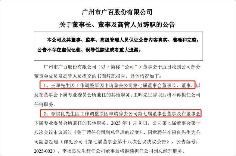 1月9日晚間,廣州市廣百股份有限公司發(fā)布公告稱,董事會(huì)于近日收到公司部分董事會(huì)成員及高管人員提交的書面辭職報(bào)告,具體情況如下: 王暉因工作調(diào)整原因申請(qǐng)辭去公司第七屆董事會(huì)董事長(zhǎng)、董事,以及在董事會(huì)下屬專業(yè)委員會(huì)所兼任的其他職務(wù);王暉辭職后將不再擔(dān)任公司任何職務(wù)。 李福良因工作調(diào)整原因申請(qǐng)辭去公司第七屆董事會(huì)董事及在董事會(huì)下屬專業(yè)委員會(huì)所兼任的其他職務(wù)。 2025年1月9日,公司第七屆董事會(huì)第十八次會(huì)議審議通過(guò)《關(guān)于聘任公司副總經(jīng)理的議案》,同意聘任李福良先生為公司副總經(jīng)理,李福良先生辭任公司董事后將繼續(xù)擔(dān)任公司副總經(jīng)理職務(wù)。 根據(jù)《公司法》和《公司章程》的有關(guān)規(guī)定,王暉和李福良辭職不會(huì)導(dǎo)致公司董事會(huì)成員低于法定人數(shù),其辭職報(bào)告自送達(dá)董事會(huì)之日起生效。為保障公司的日常經(jīng)營(yíng)不受影響,公司董事會(huì)征得王暉本人同意,在公司按照法定程序選舉產(chǎn)生新任董事長(zhǎng)之前,其將繼續(xù)履行公司董事長(zhǎng)、法定代表人職責(zé)。 公司將盡快按照法定程序完成補(bǔ)選董事及選舉董事長(zhǎng)工作。 鐘勇因工作調(diào)整原因申請(qǐng)辭去公司副總經(jīng)理職務(wù)。其辭職報(bào)告自送 達(dá)董事會(huì)之日起生效。鐘勇辭職后將不再擔(dān)任公司任何職務(wù)。 謝安賢因工作調(diào)整原因申請(qǐng)辭去公司副總經(jīng)理職務(wù)。其辭職報(bào)告自送達(dá)董事會(huì)之日起生效。謝安賢辭職后將不再擔(dān)任公司任何職務(wù)。 根據(jù)廣百股份披露2024年第三季度報(bào)告。前三季度公司實(shí)現(xiàn)營(yíng)業(yè)收入40.74億元,同比下降5.76%;歸母凈利潤(rùn)5252.93萬(wàn)元,同比增長(zhǎng)73.58%;扣非凈利潤(rùn)2573.92萬(wàn)元,同比增長(zhǎng)56.17%。 |