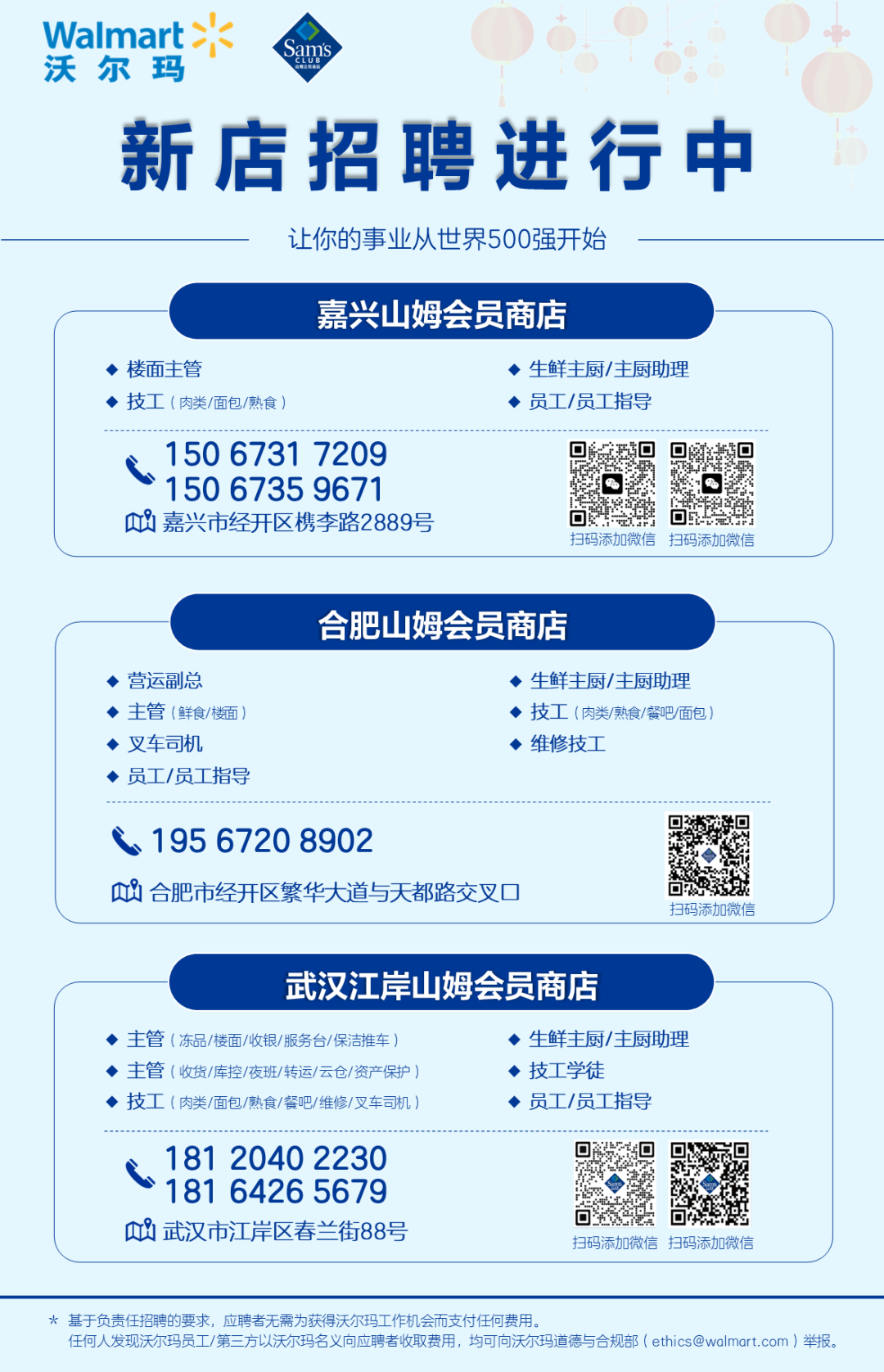 《職業(yè)零售網》獲悉,1月15日,沃爾瑪招聘官方公眾號發(fā)布“1月份新店招聘信息”,宣布山姆會員商店將在嘉興、合肥、武漢開設新店,并招聘相關工作人員。 根據(jù)招聘信息,此次新店招聘涵蓋了多個關鍵職位,包括但不限于鮮食/銷售支持/商品副總經理、營運副總、生鮮大廚/大廚助理等管理崗位,以及前臺/鮮食/樓面/線上運營/電商/收貨/資產保護主管等運營崗位,還有海鮮肉類/熟食/面包技工等專業(yè)技術崗位,以及人事行政經理、HR專員/HR實習生等人力資源崗位,會籍推廣員等市場營銷崗位,和前臺/鮮食/樓面/線上運營/電商/收貨員工等基礎崗位。 截至目前,山姆會員商店已經在全國29個城市成功開設了53家門店,并且提供了包括極速達、全城配、全國配在內的多種線上配送服務,以滿足不同消費者的購物需求。 |